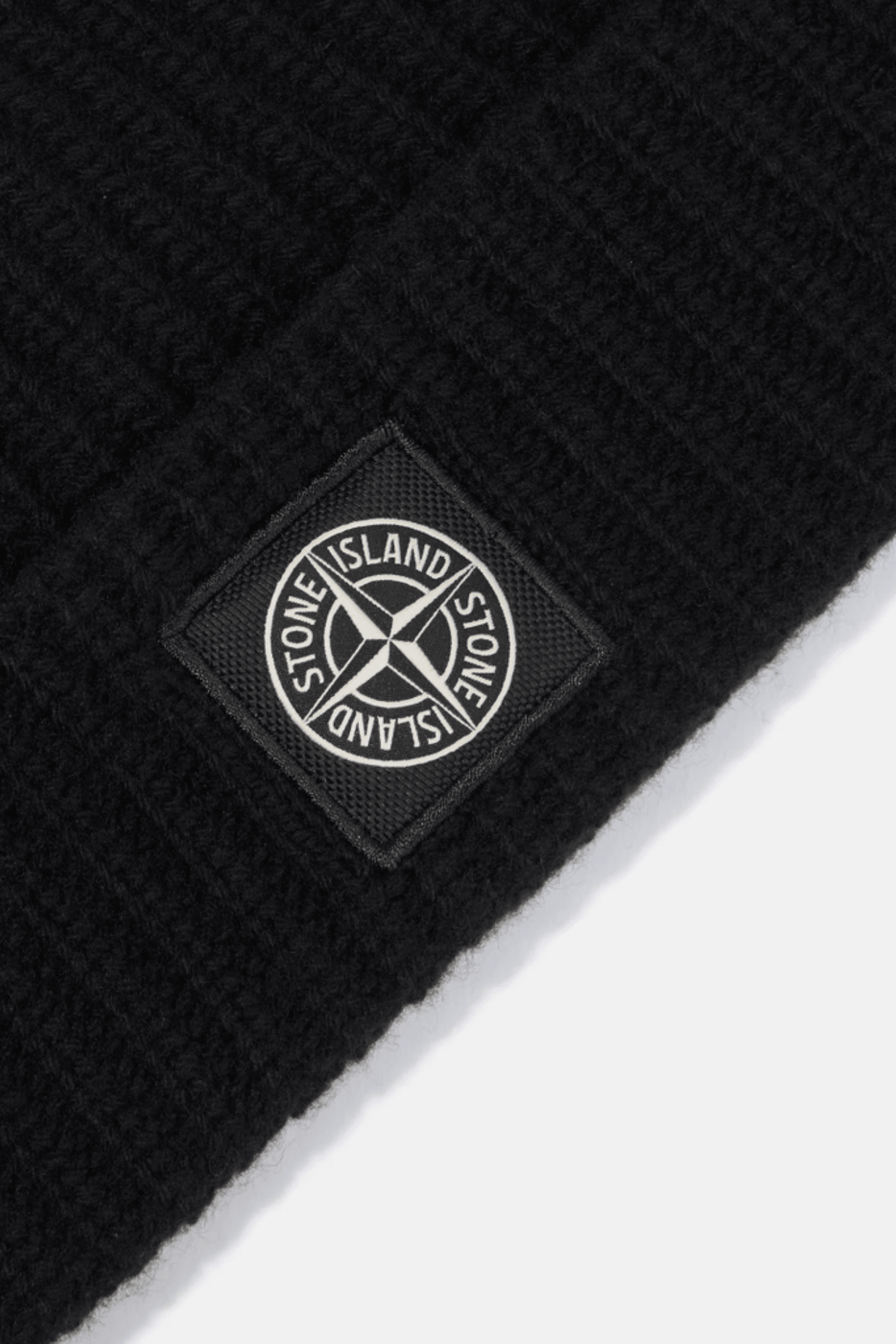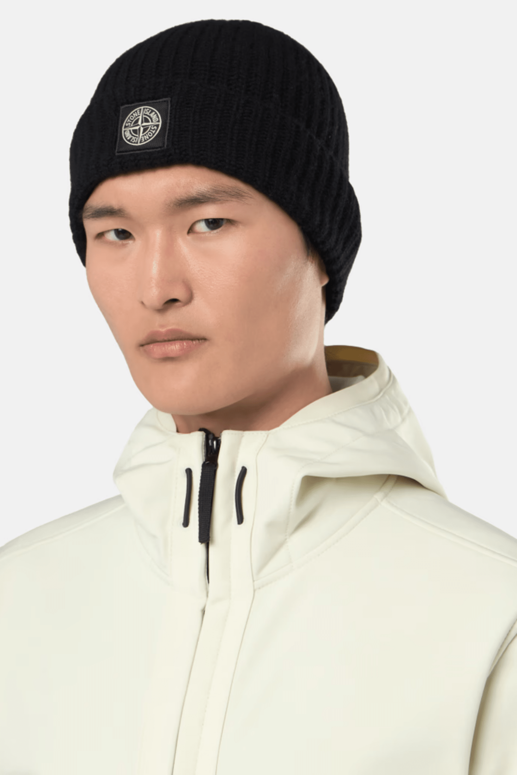 Ce Bonnet Laine Geelong Côtelée Noir en maille de laine vierge noire, avec design côtelé et écusson logo cousu sur le devant.