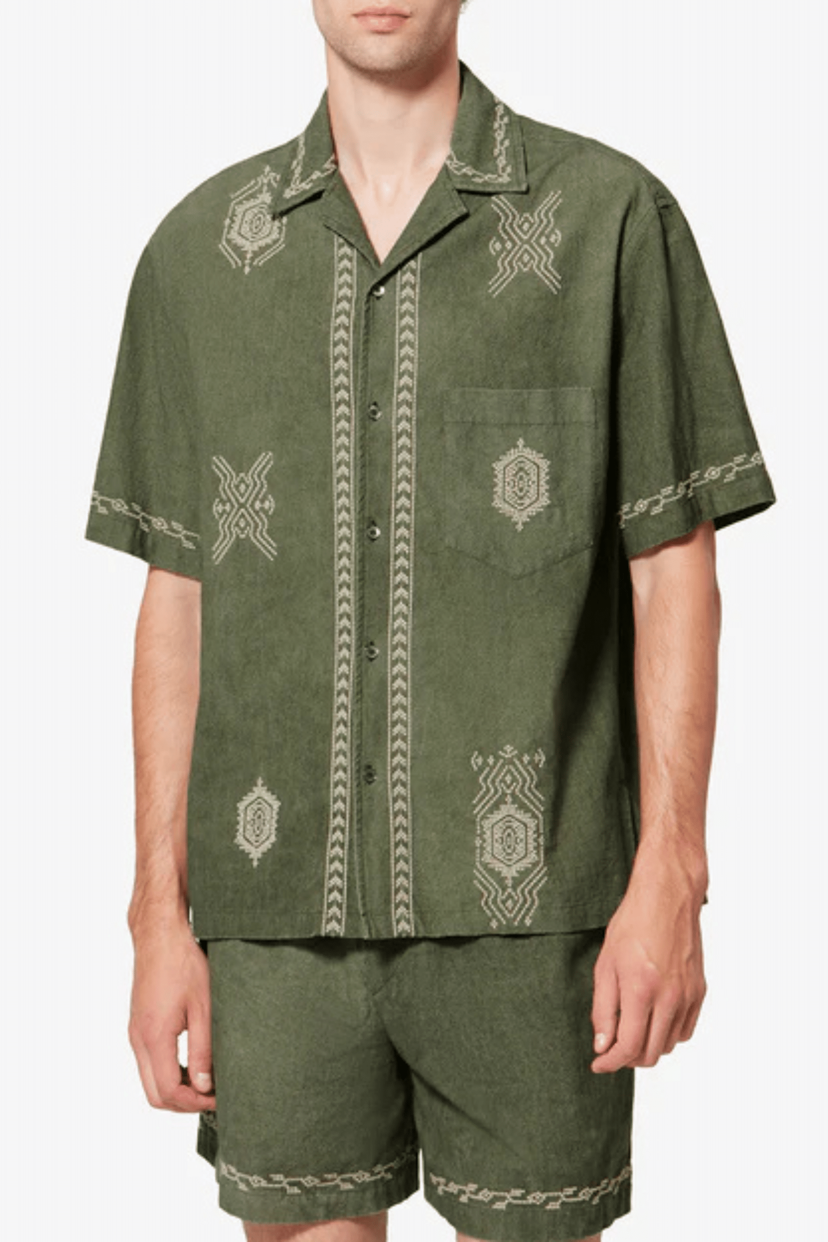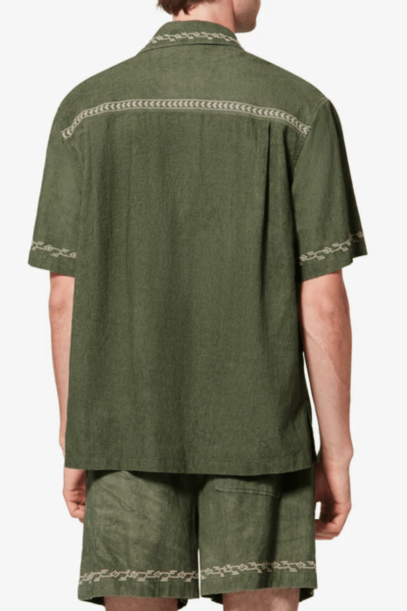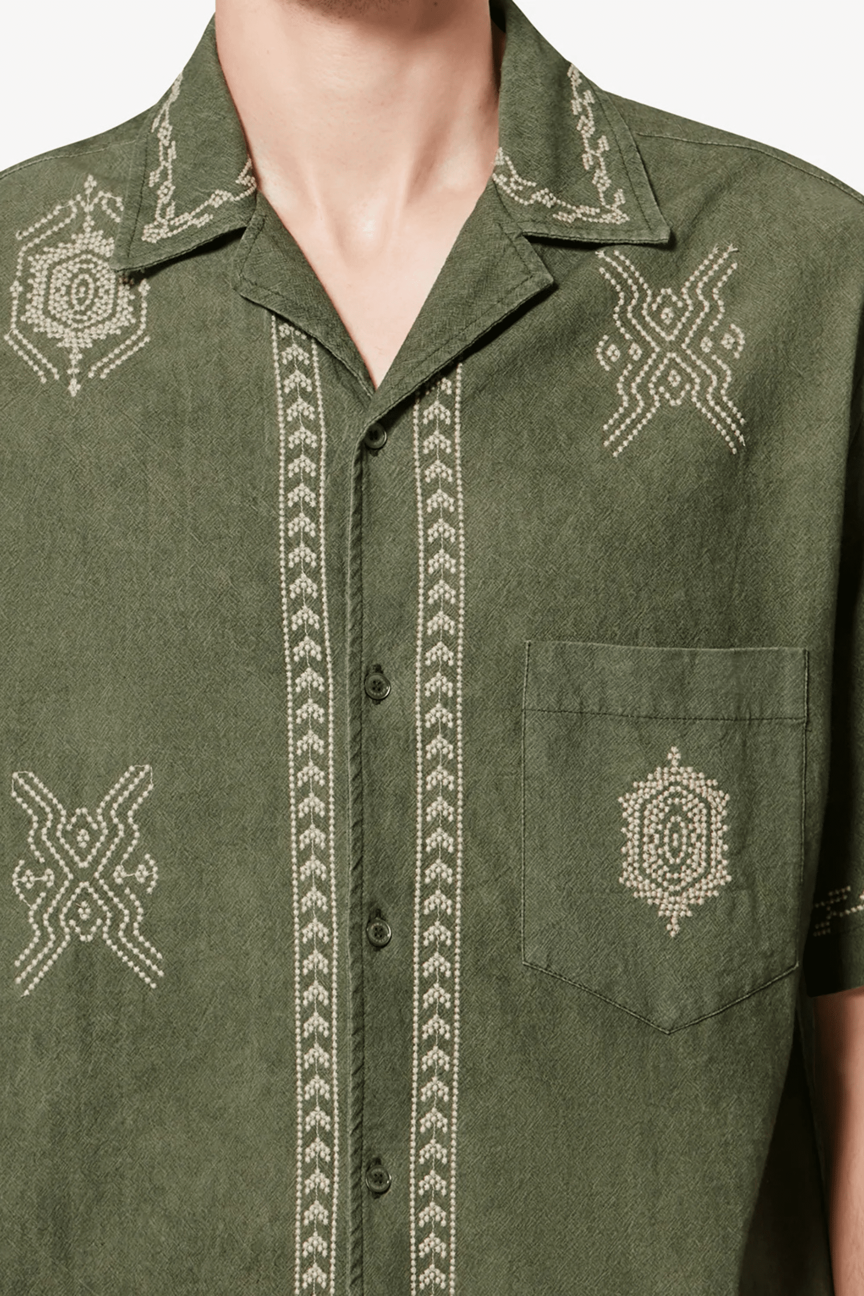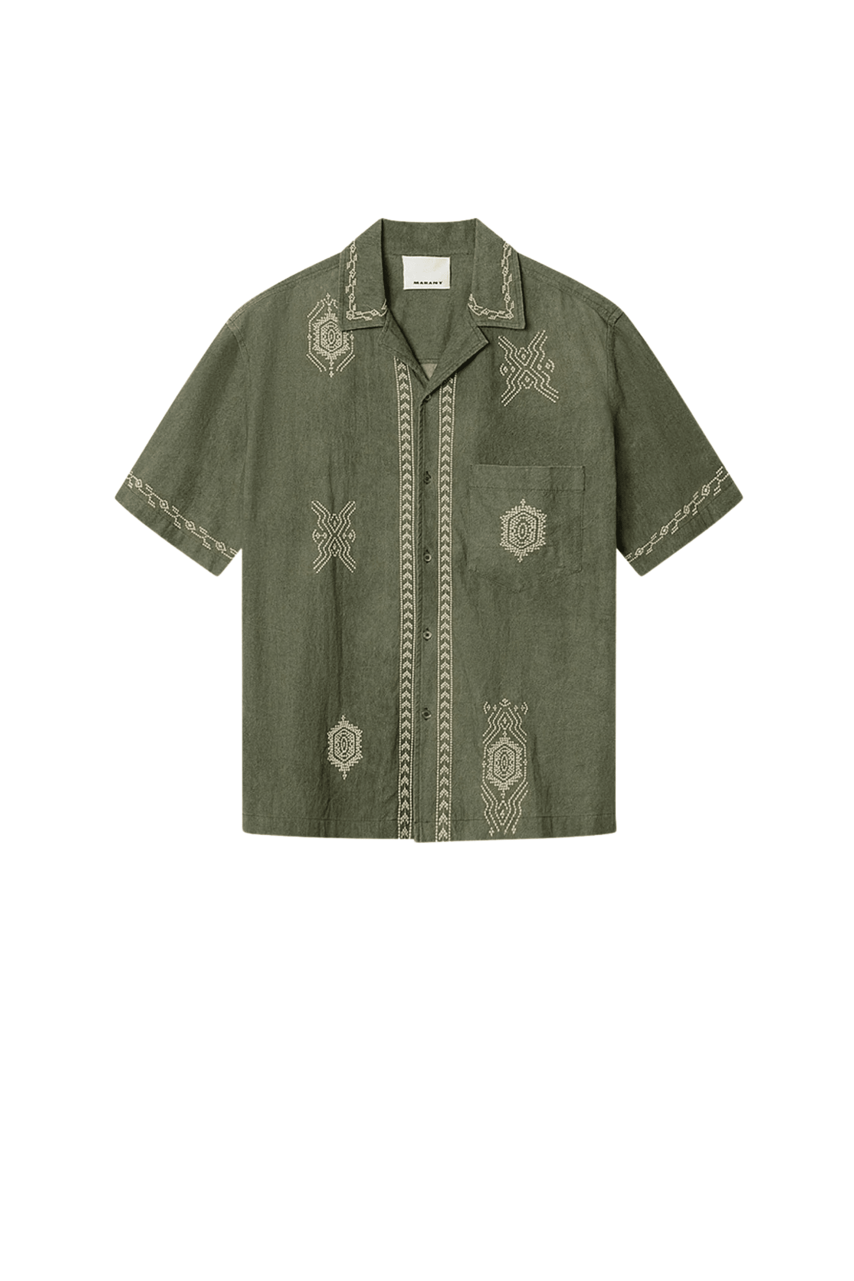 Chemise Coton Zekim Kaki Clair avec broderie. Manches courtes. Fermetures par boutons ton sur ton. Poche plaquée sur la poitrine.