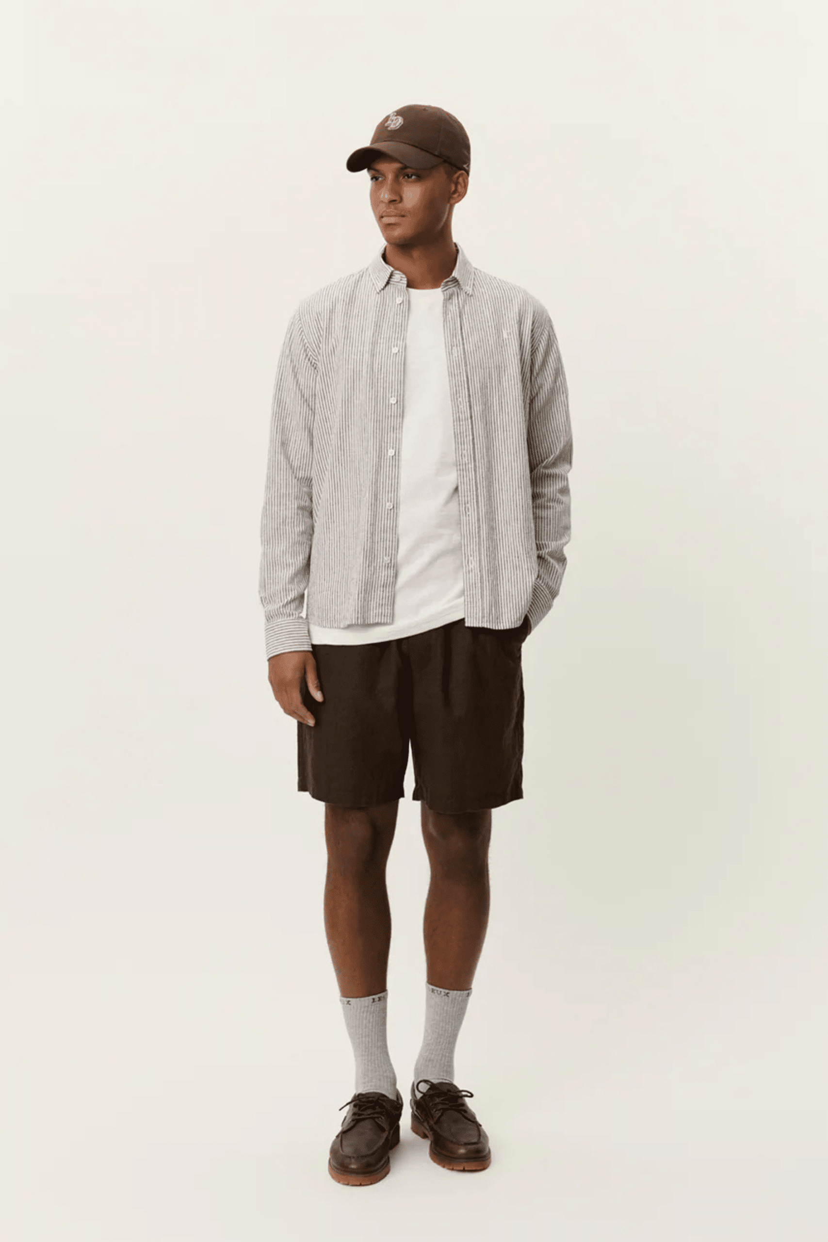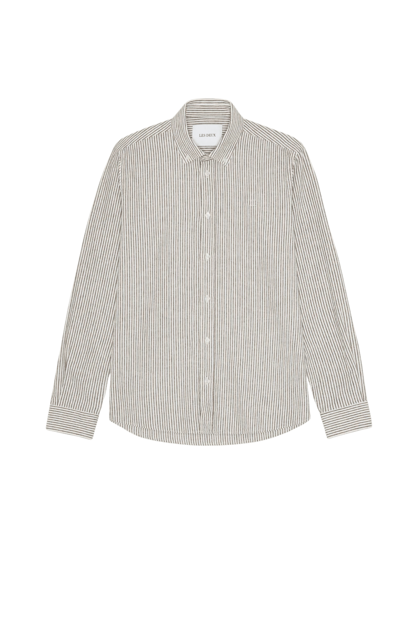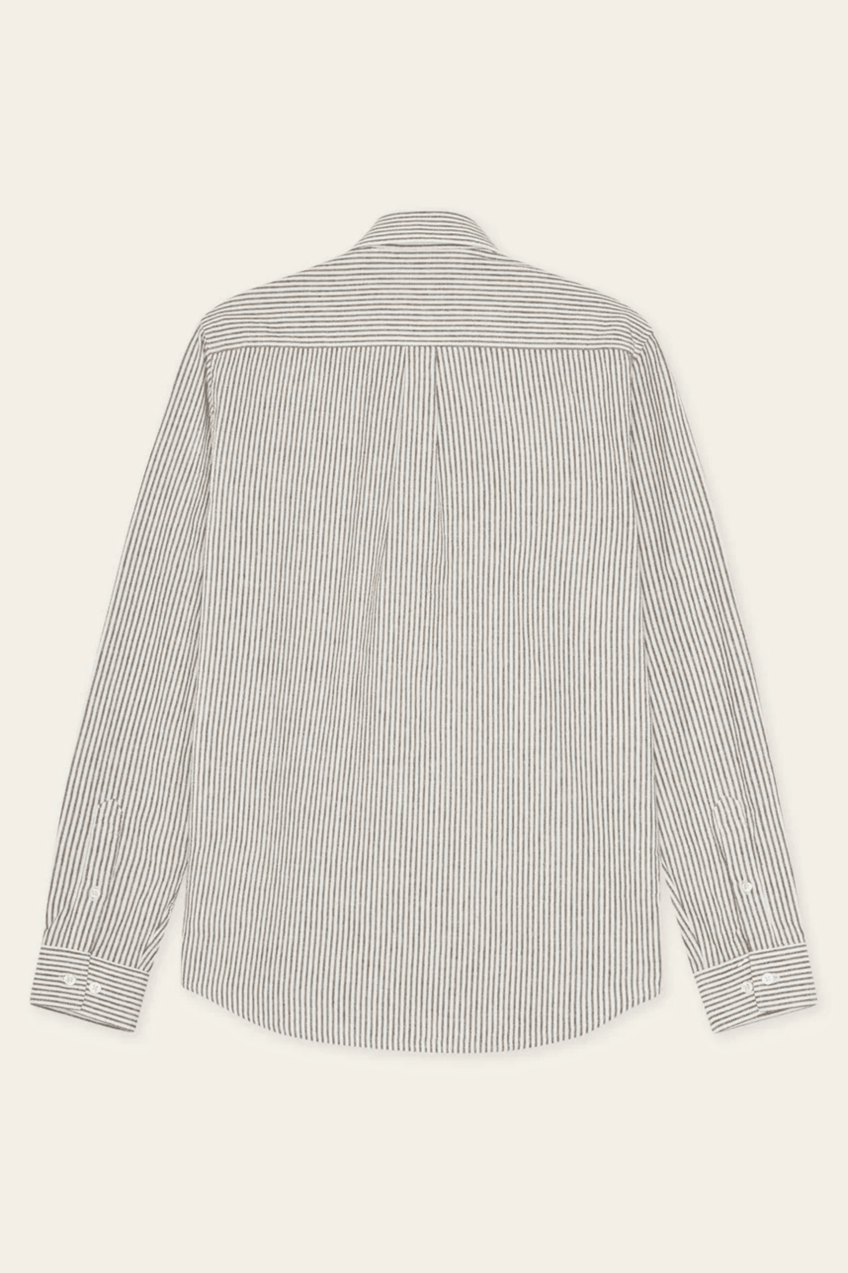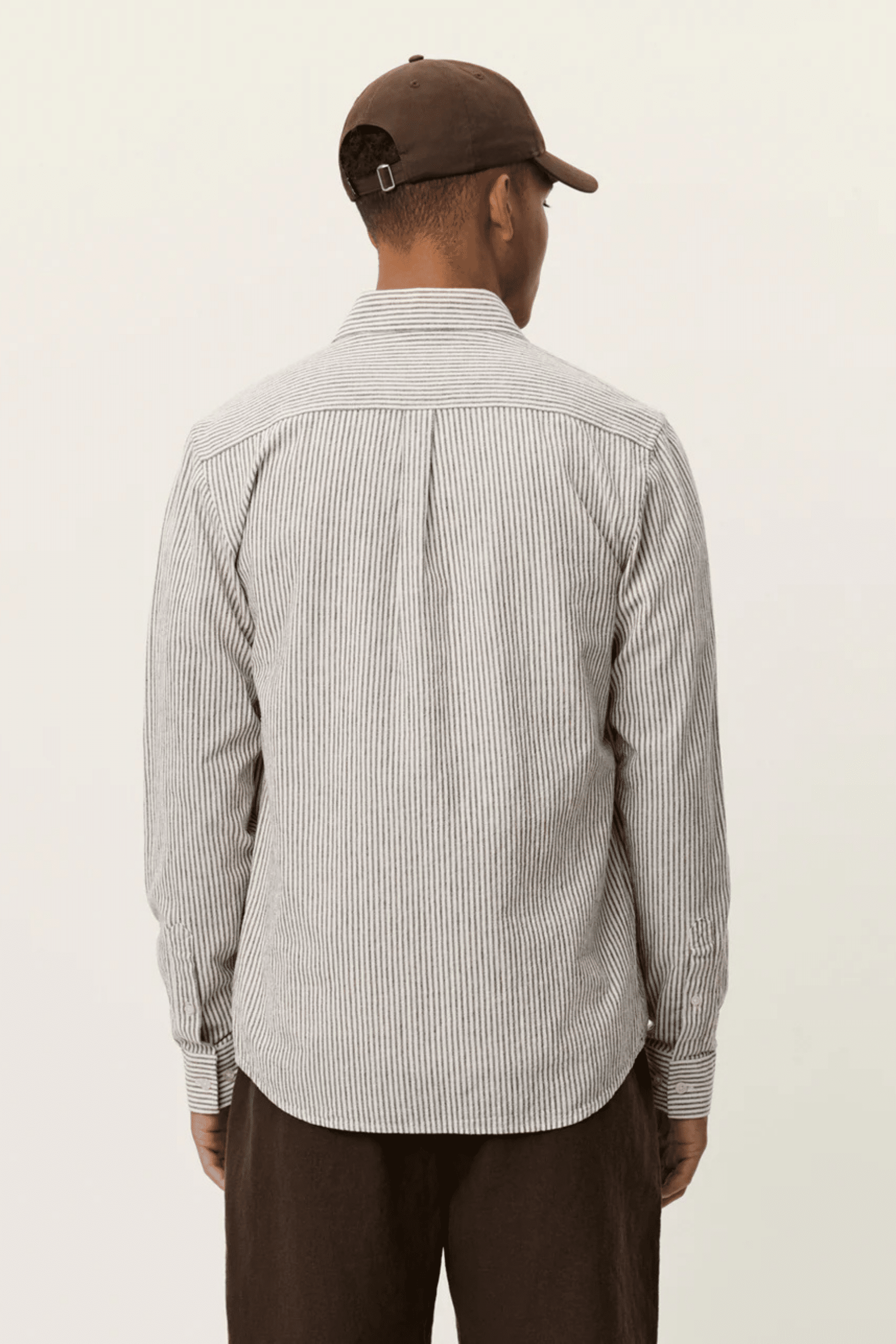 Chemise Konrad Coton Lin Rayée Marron. Col boutonnée. Logo brodé ton sur ton sur la poitrine. Poignets boutonnés. Ourlet arrière arrondi.