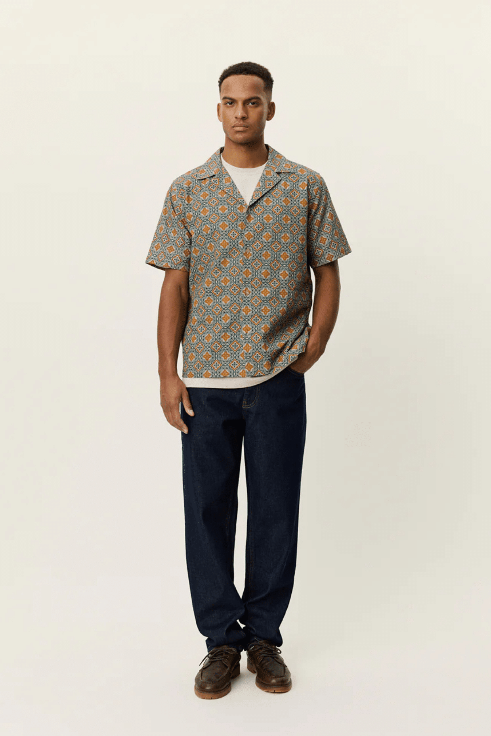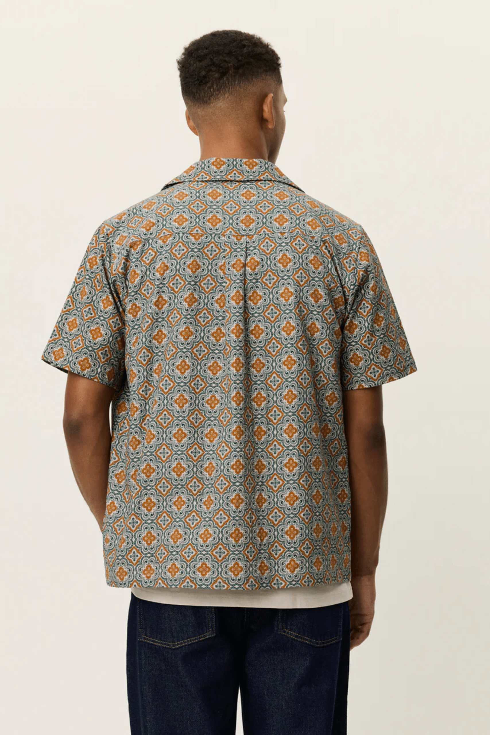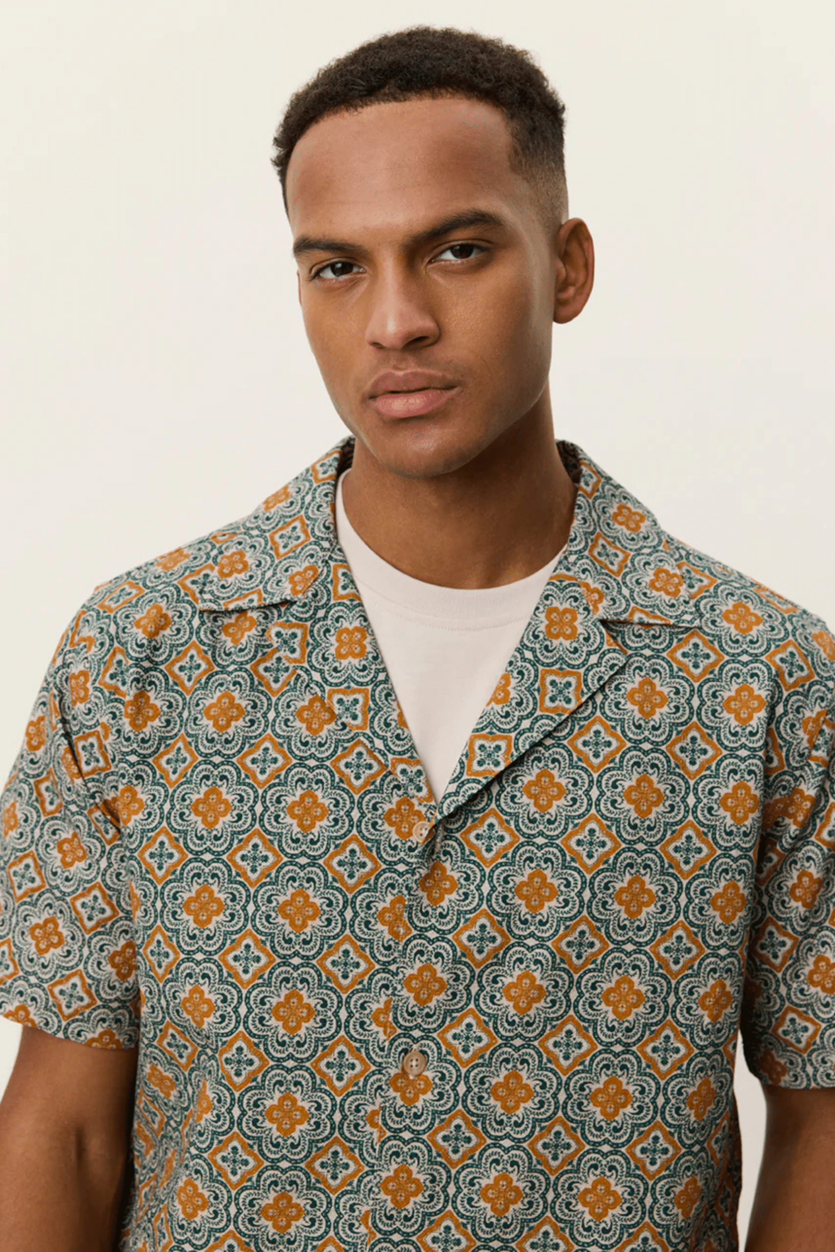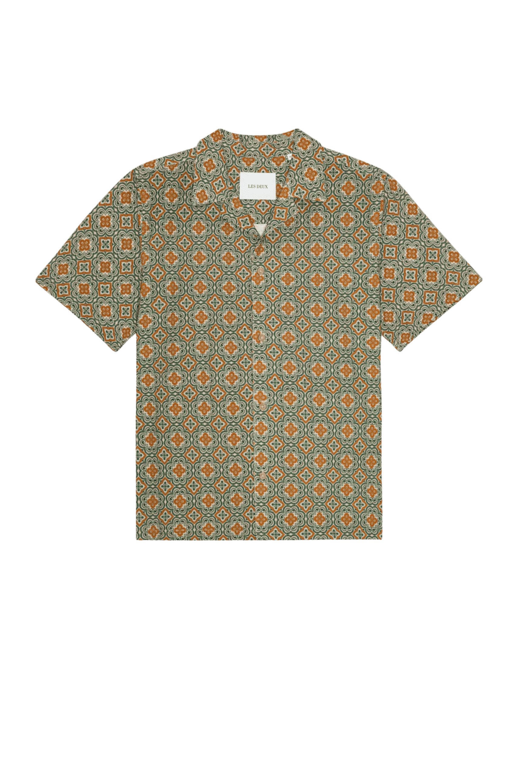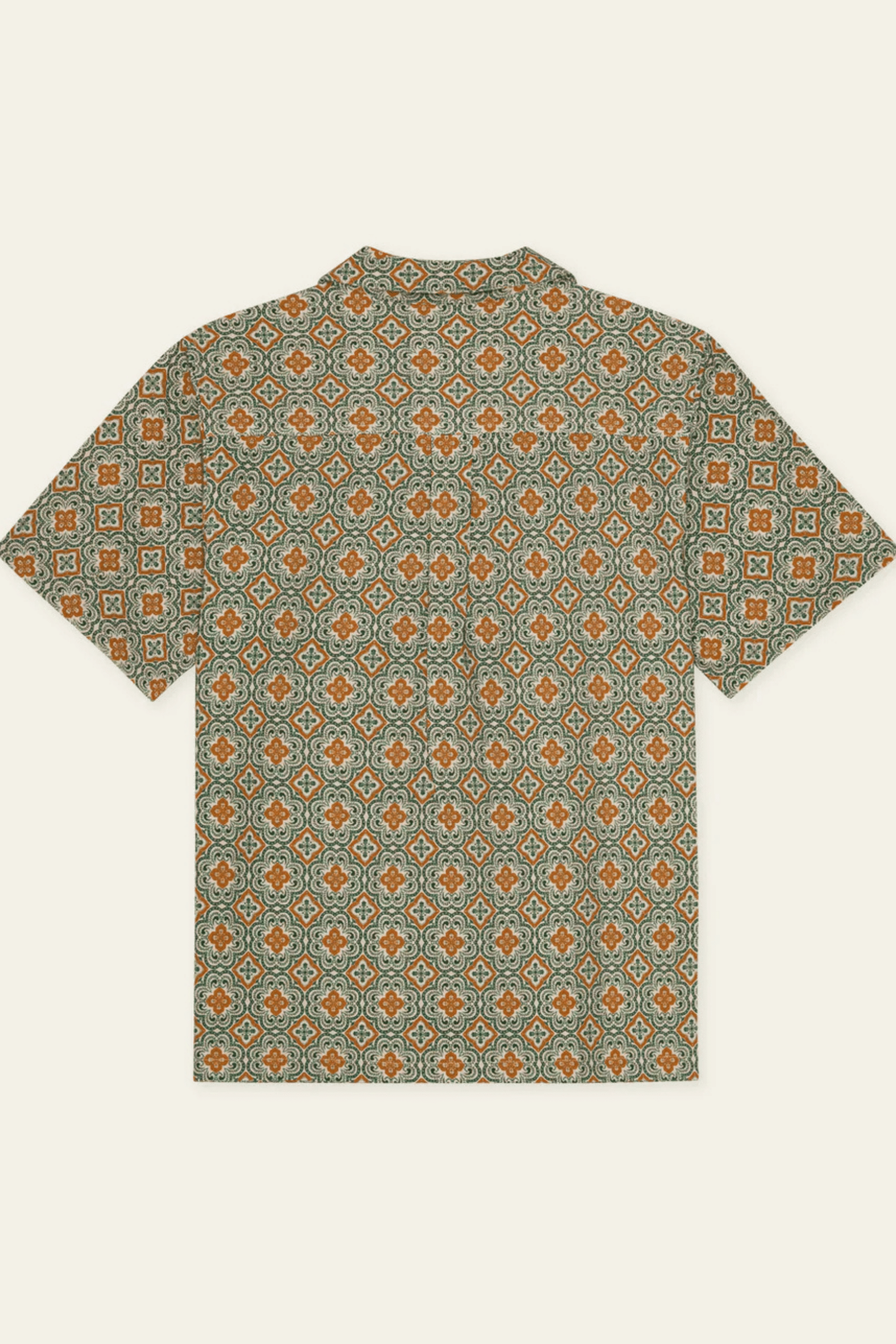 Chemise Lukas Arabesque Vert en coton. Manches courtes. Col cubain ouvert. Fermeture à boutons sur le devant. Imprimé arabesque intégral.