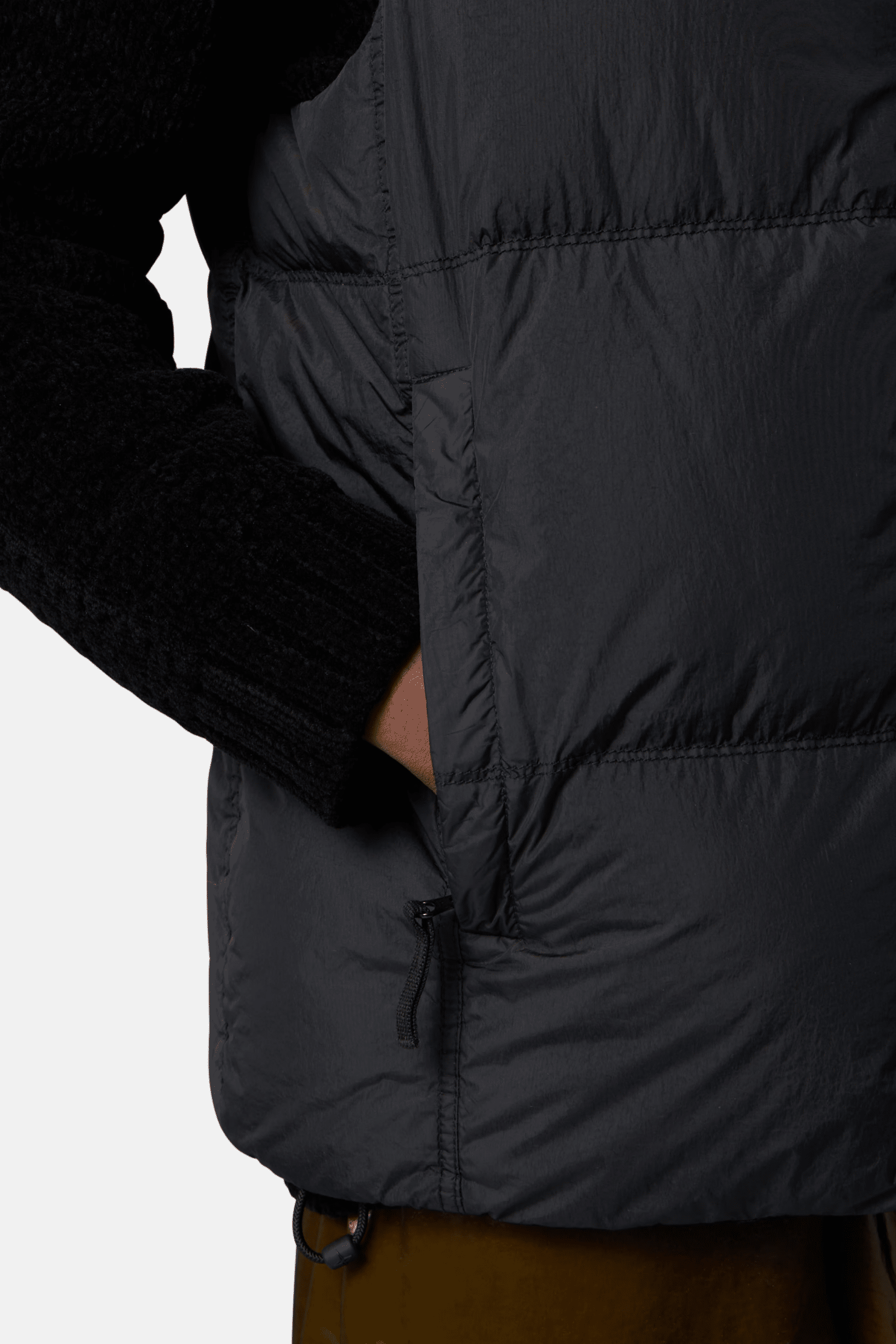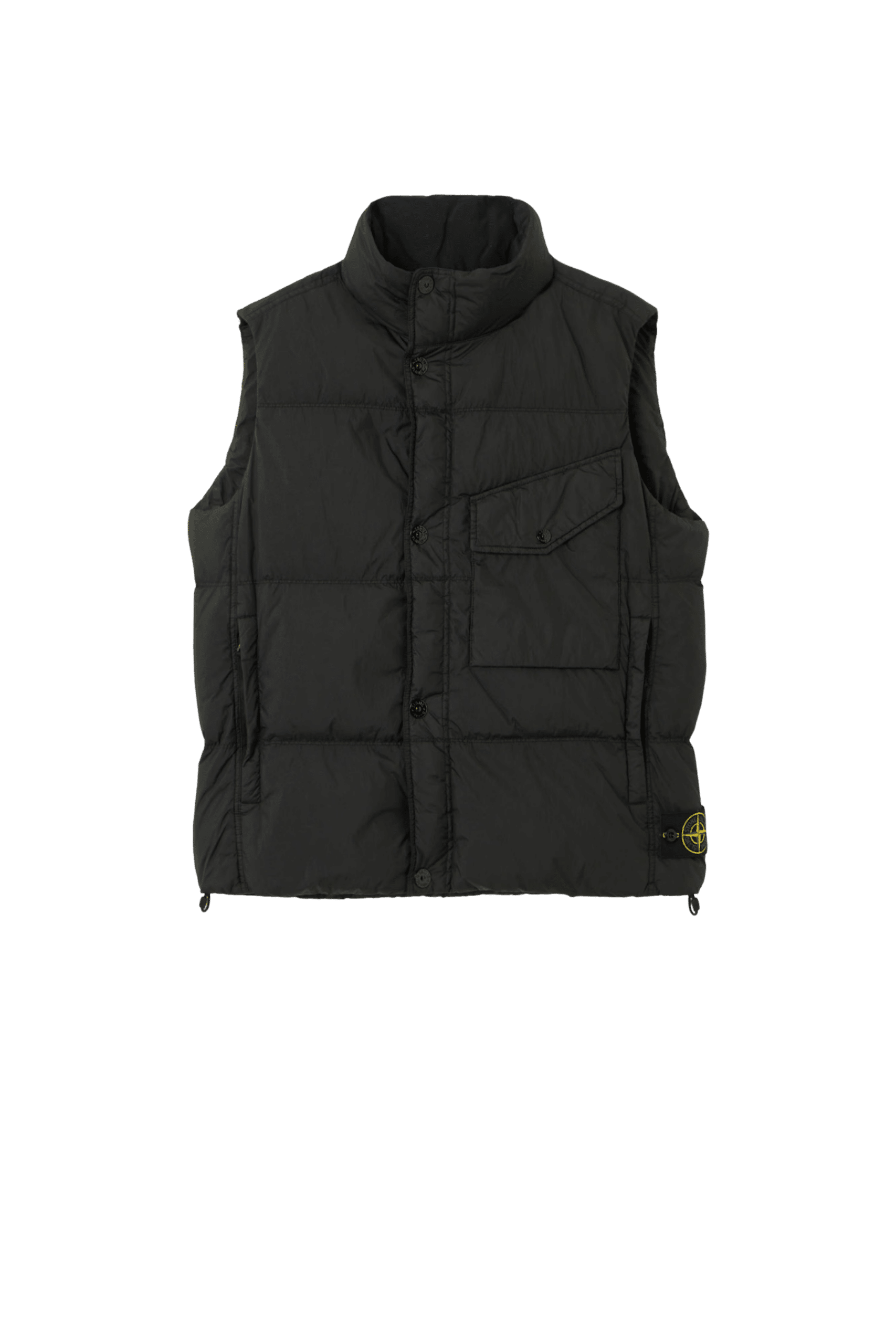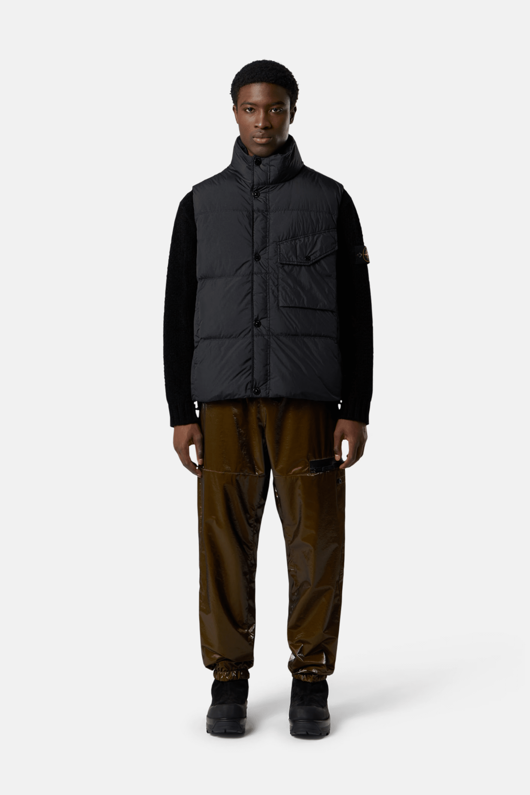 Gilet Doudoune Nylon Noir. Col montant. Poche a soufflet à rabat./ Poches verticales zippées. Poche intérieure boutonnée. Logo au bas du gilet.