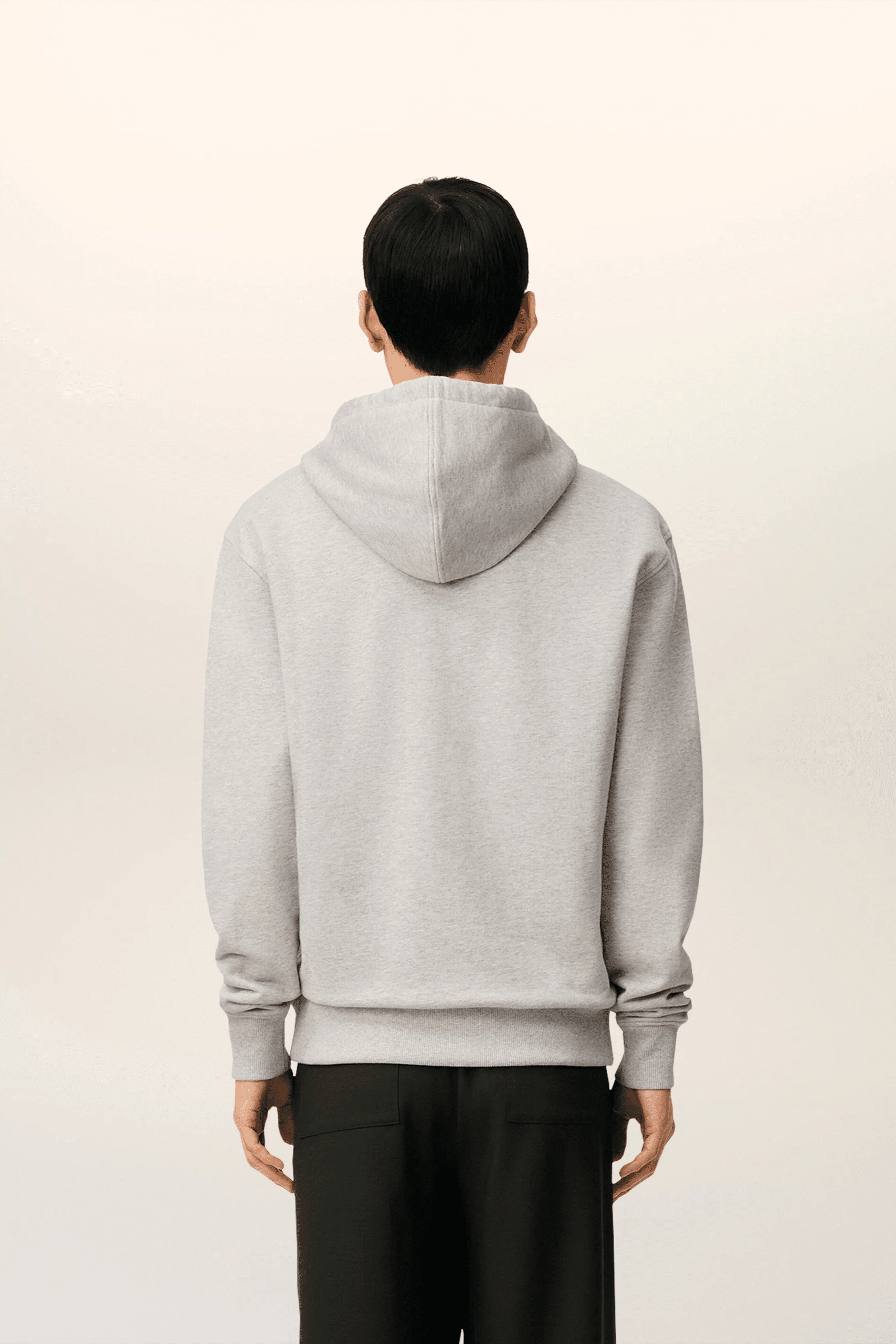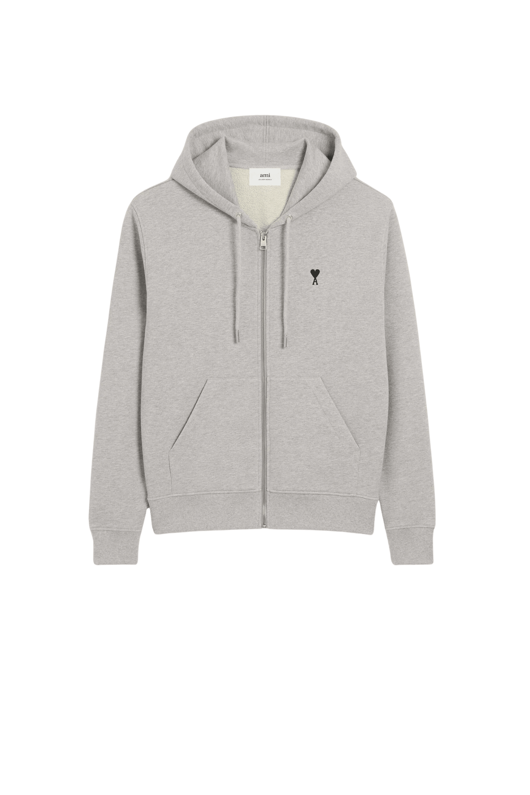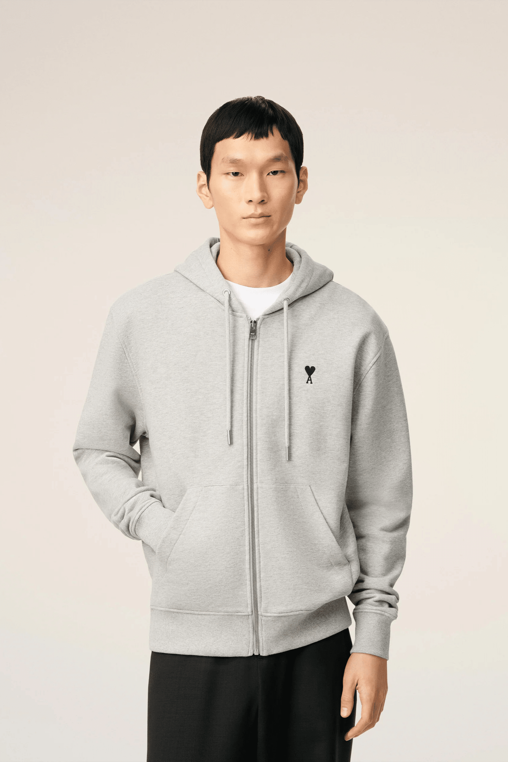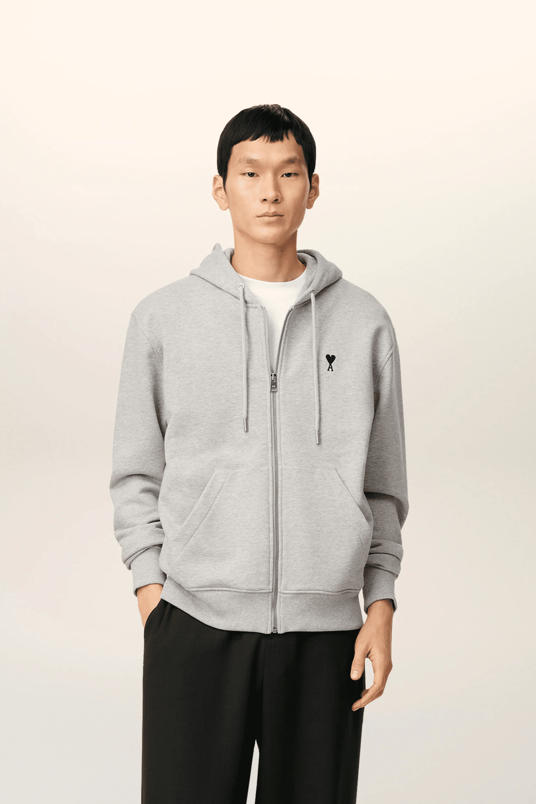 Hoodie Zippé Coton Gris Cœur Noir. Embouts et œillets signé en métal. Coupe classique. Cœur noir brodé sur la poitrine. Poche kangourou.