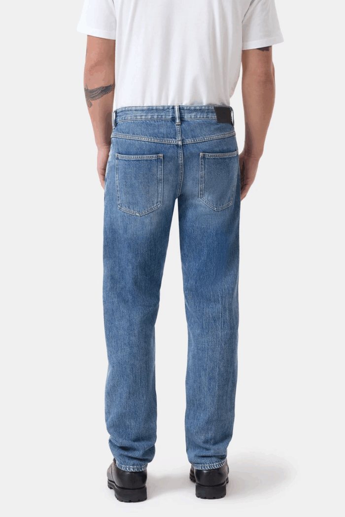 - Apparence : Denim bleu avec un lavage worn distinctif avec whiskers, structure twill