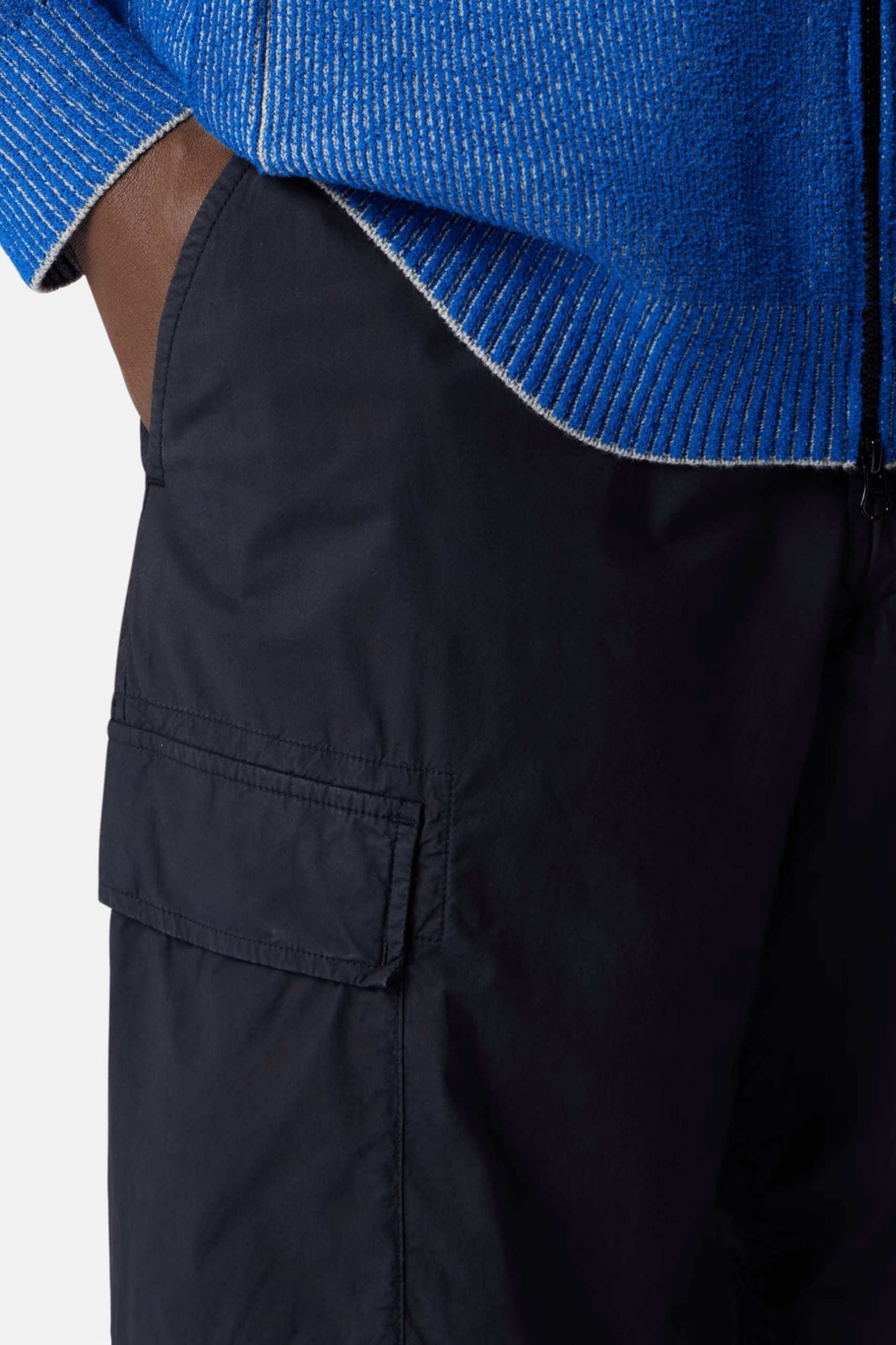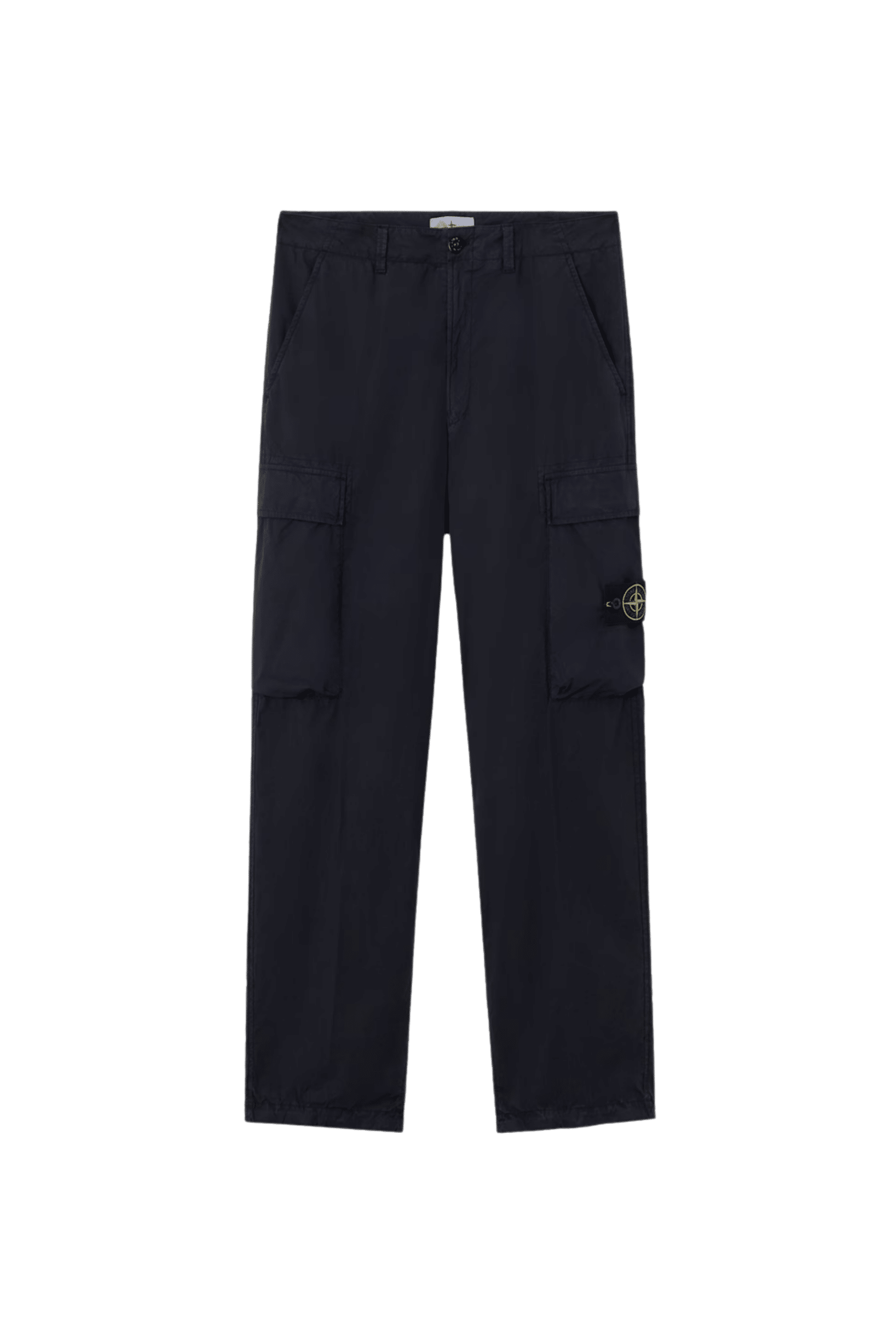 Pantalon Cargo Coton Extensible Marine. Poches mains en biais. Poches cargo à rabat. Poche arrière à rabat. Badge sur la poche cargo. Coupe ample.