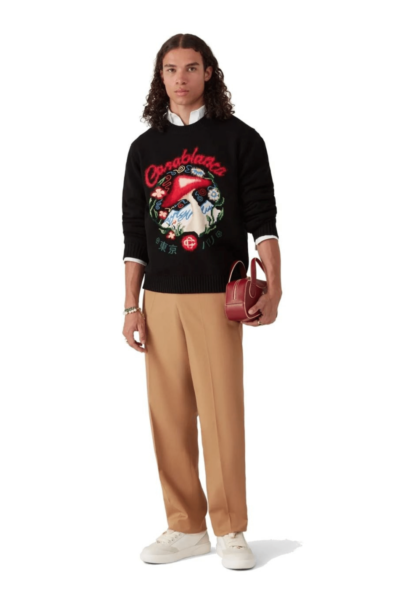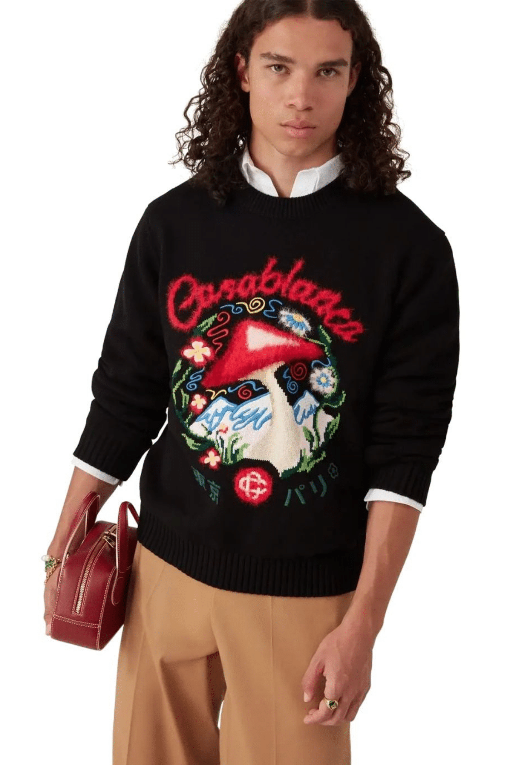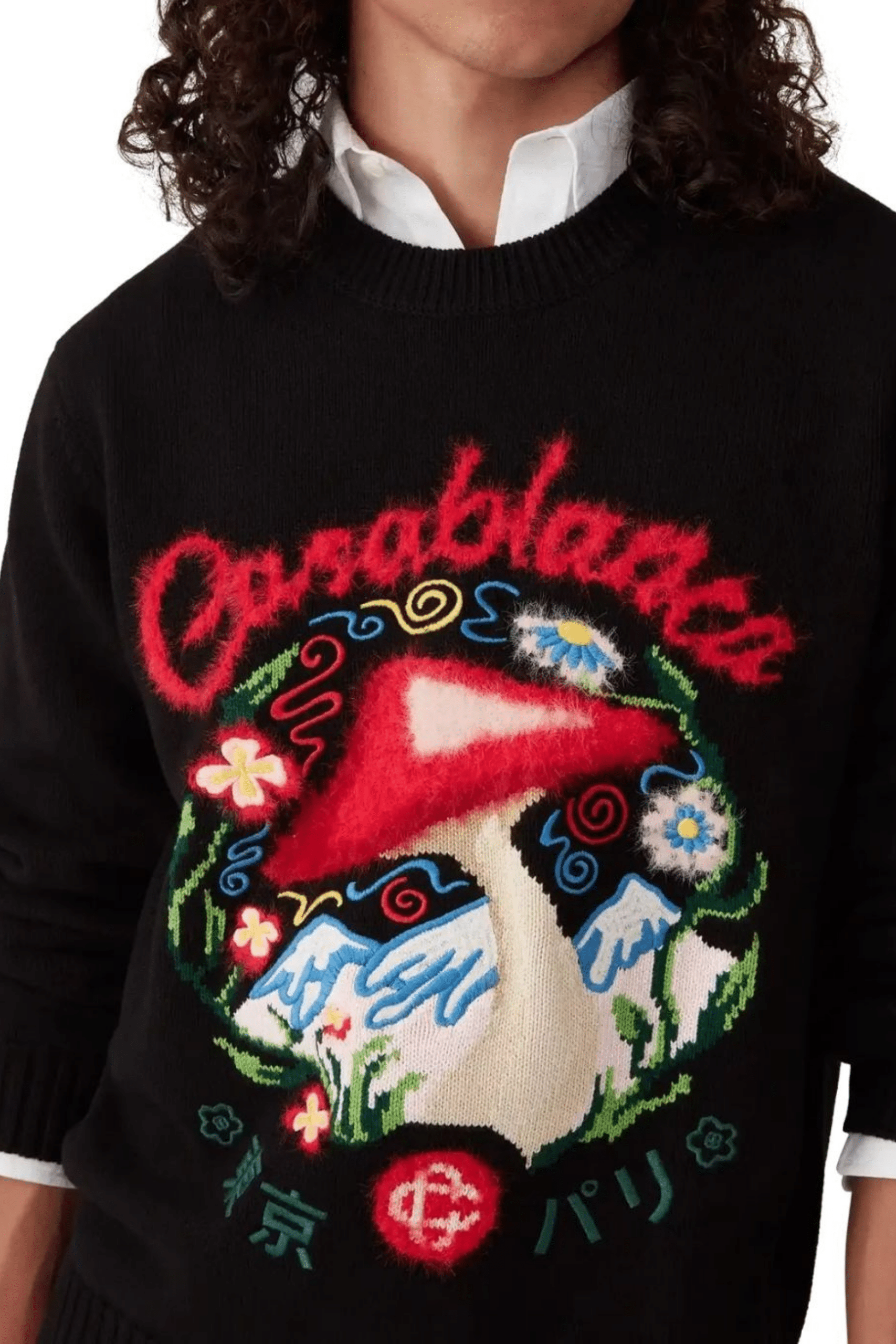 Pull Brodé Champignon Coton Noir. Motif en intarsia du champignon emblématique multicolore. Encolure arrondie. Coupe décontractée.
