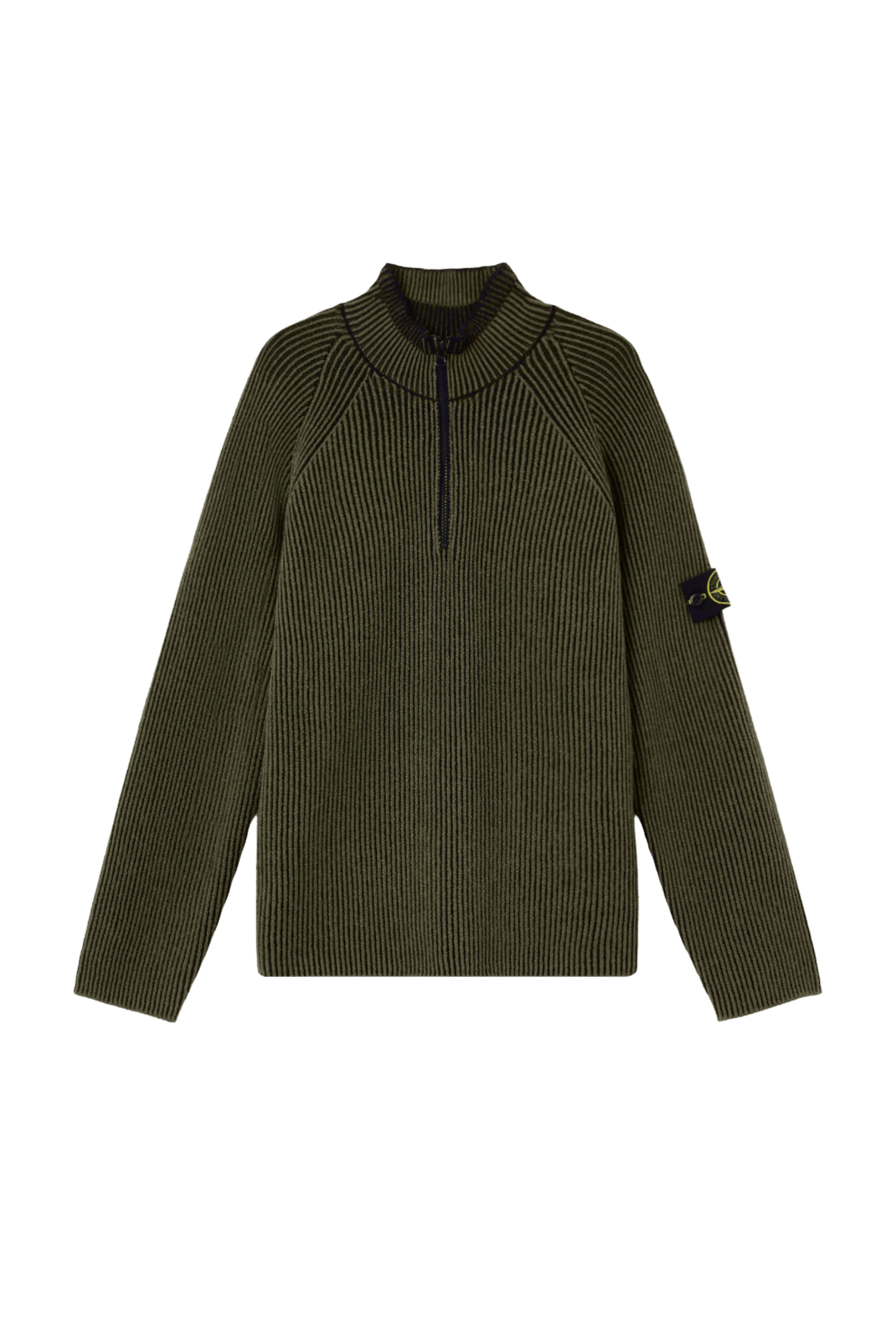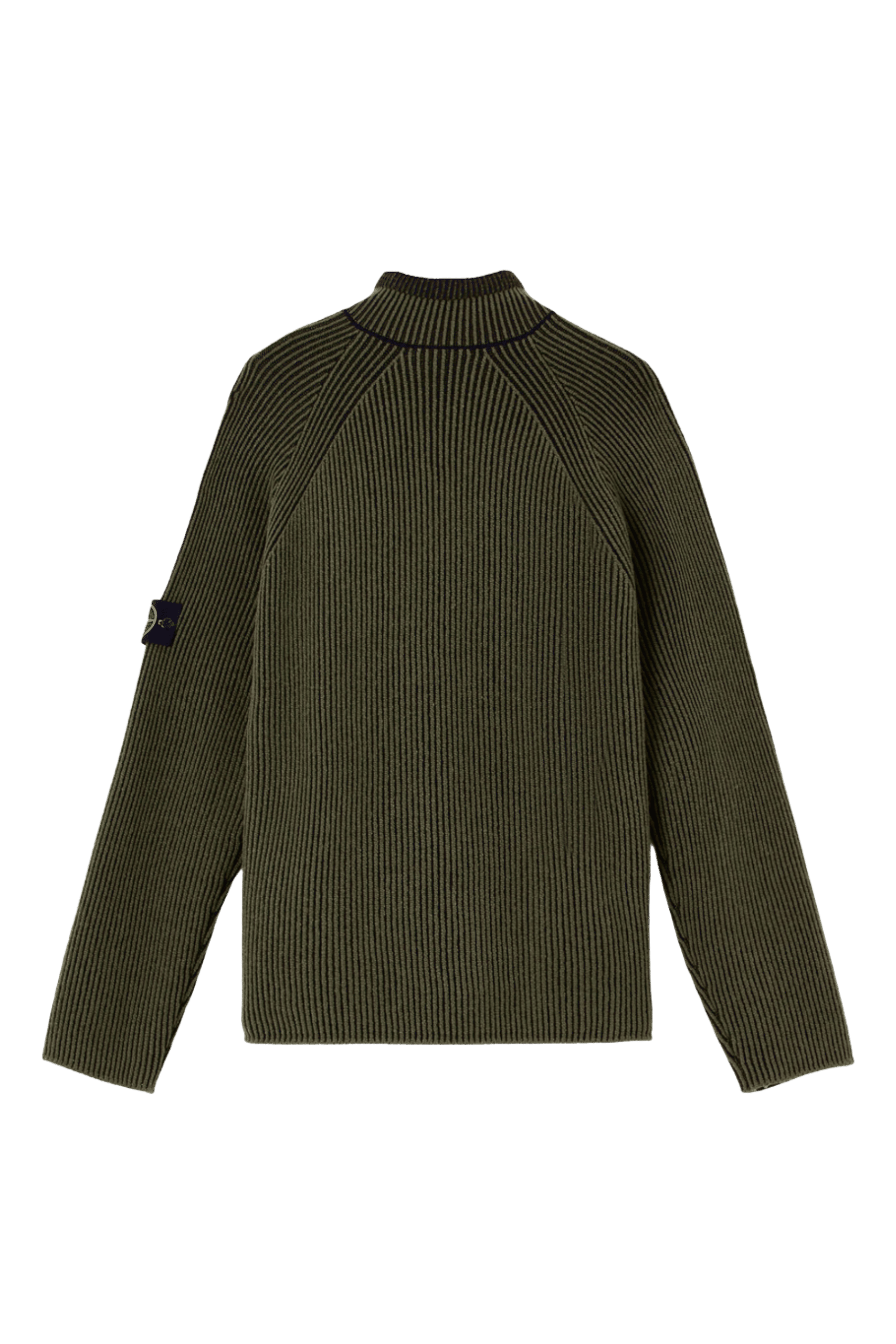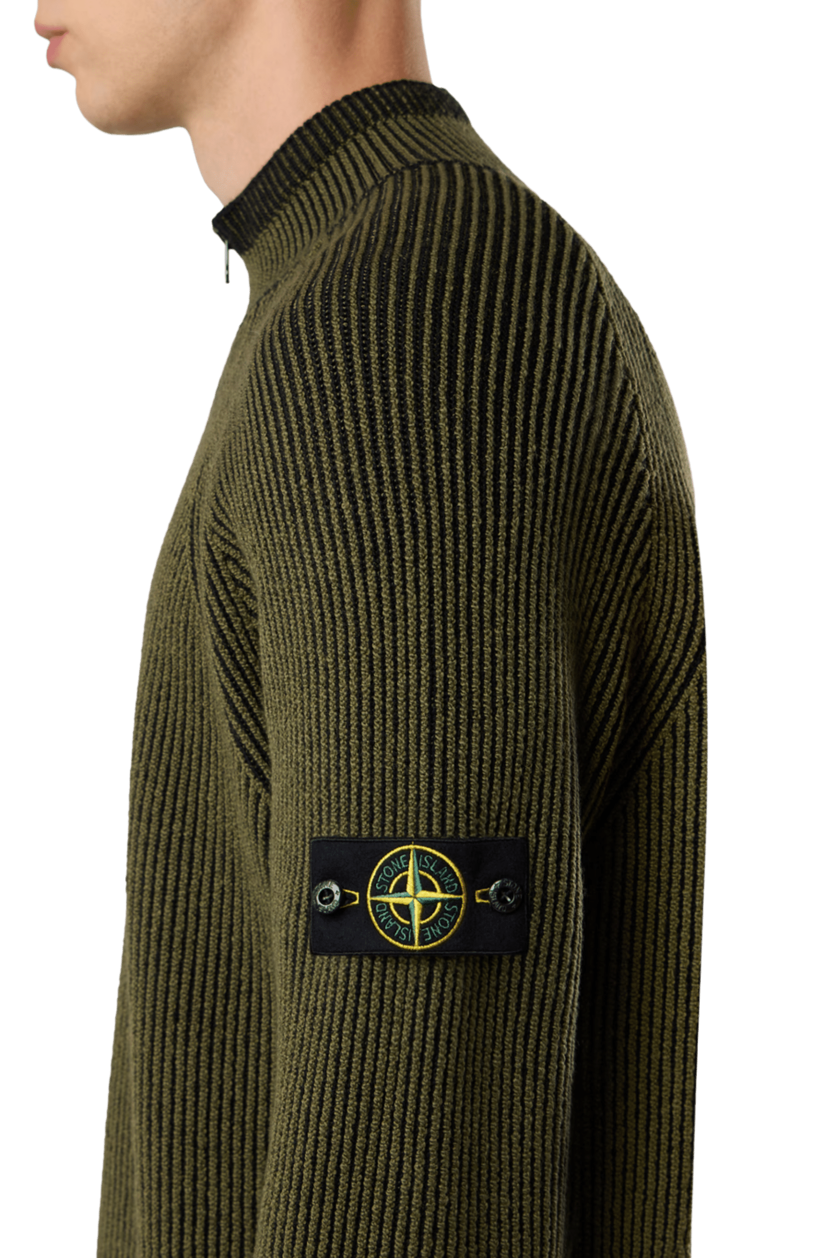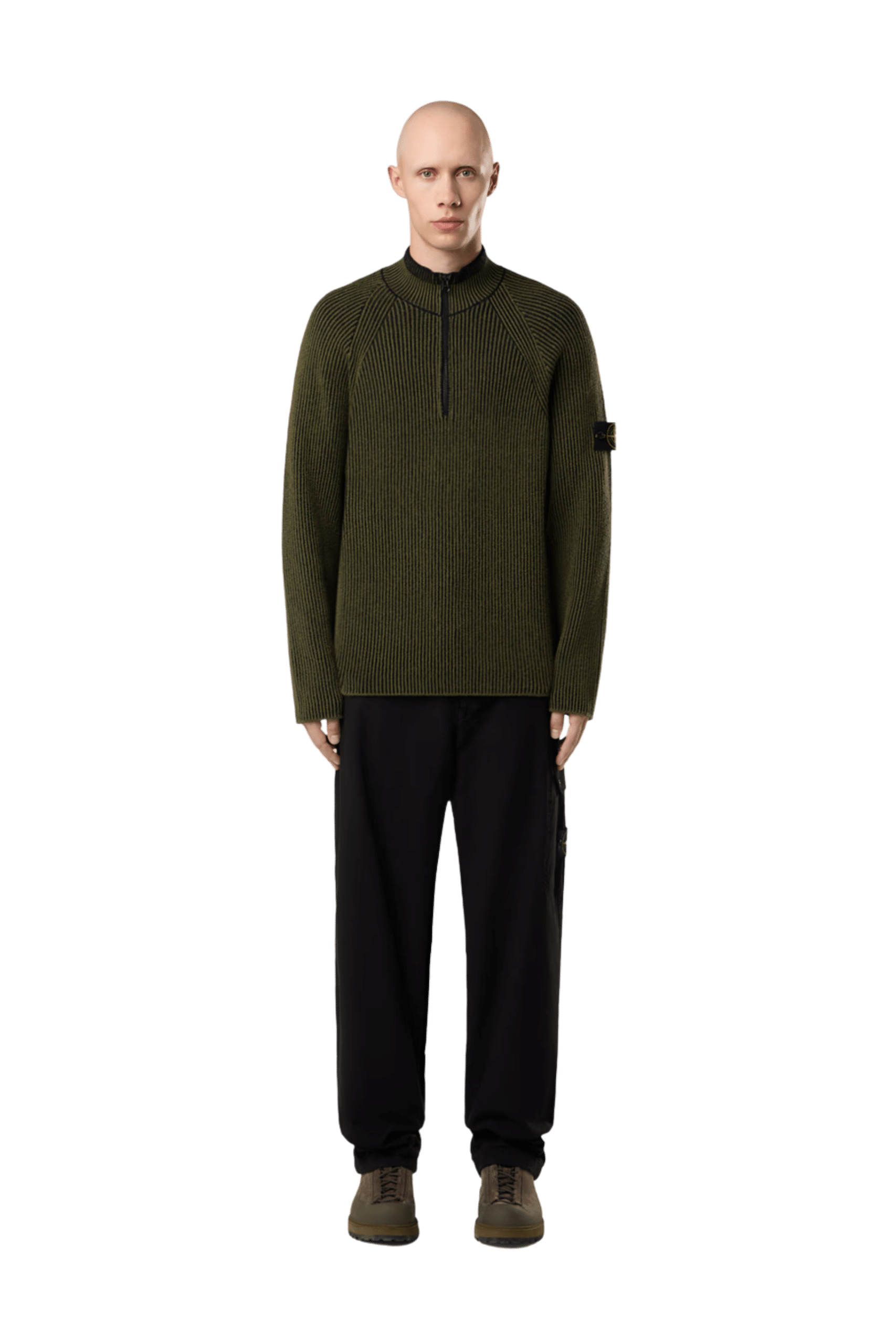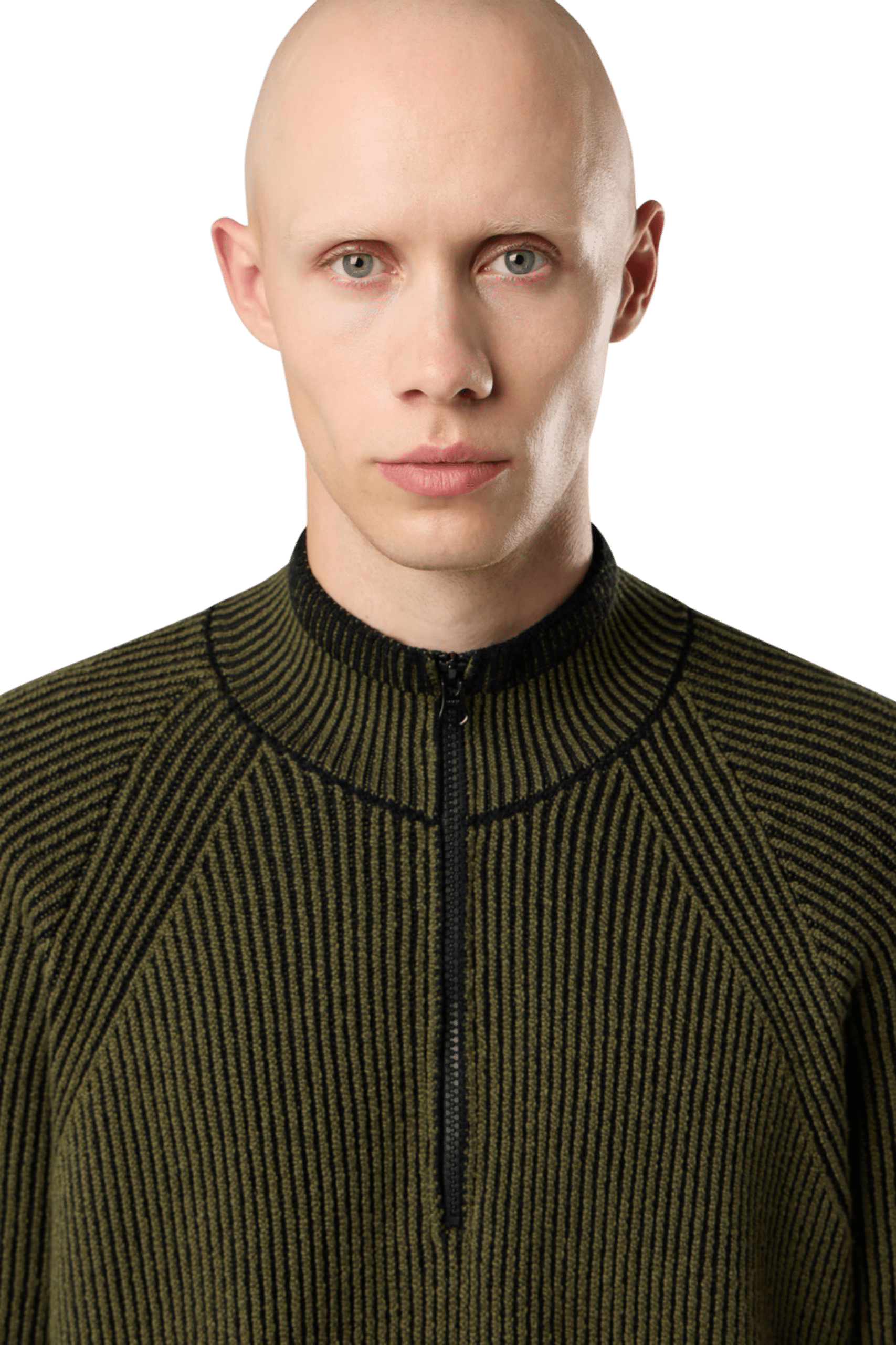 Pull Col Zippé Laine Kaki. Maille côtelée en mélange de laine et coton. Col montant zippé. Manches raglan. Patch logo sur la manche gauche.