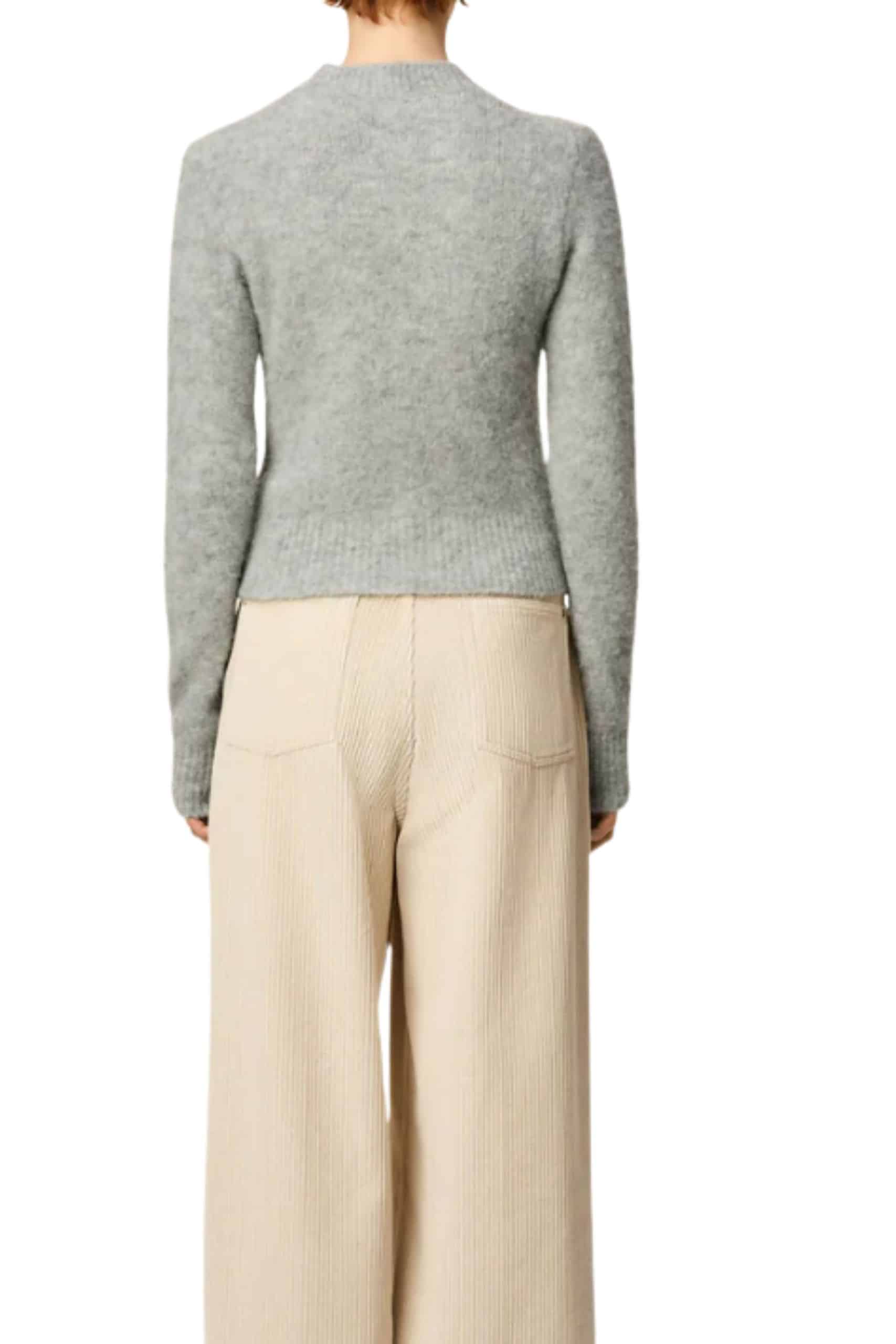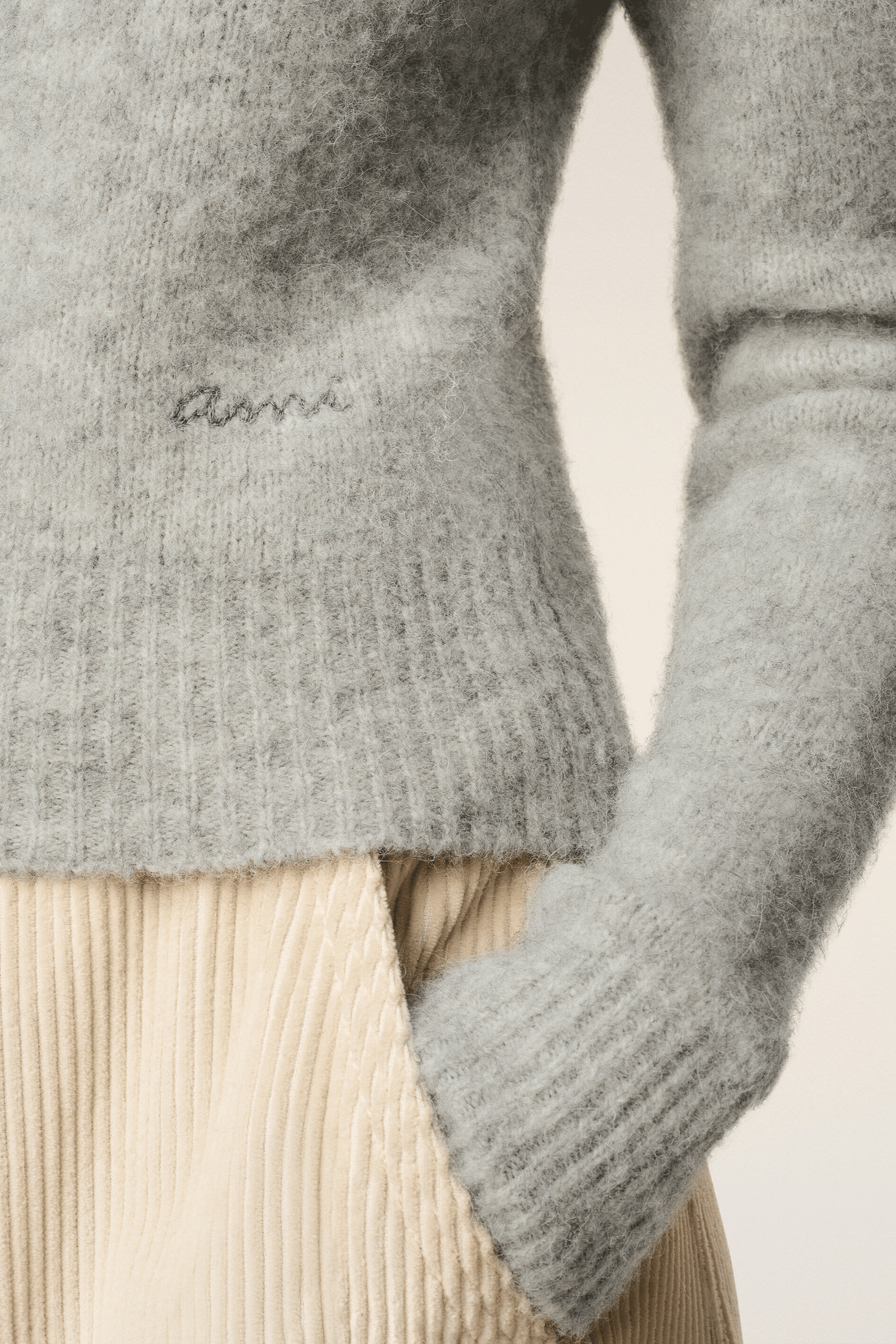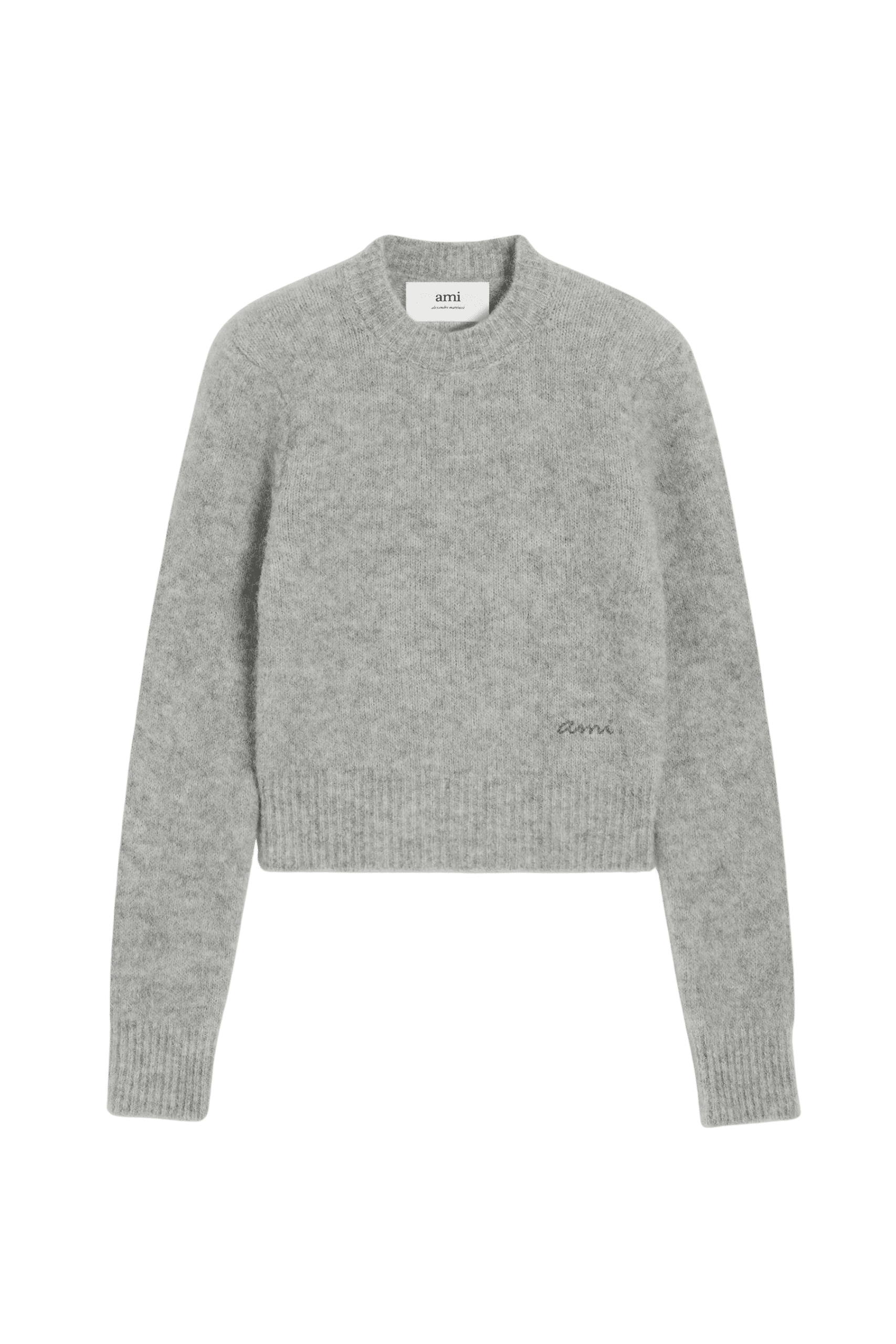Pull Laine et Alpaga Gris. Encolure arrondie. Col, manches et ourlets en bord-côtes. Broderie « ami » au dessus de l’ourlet gauche.