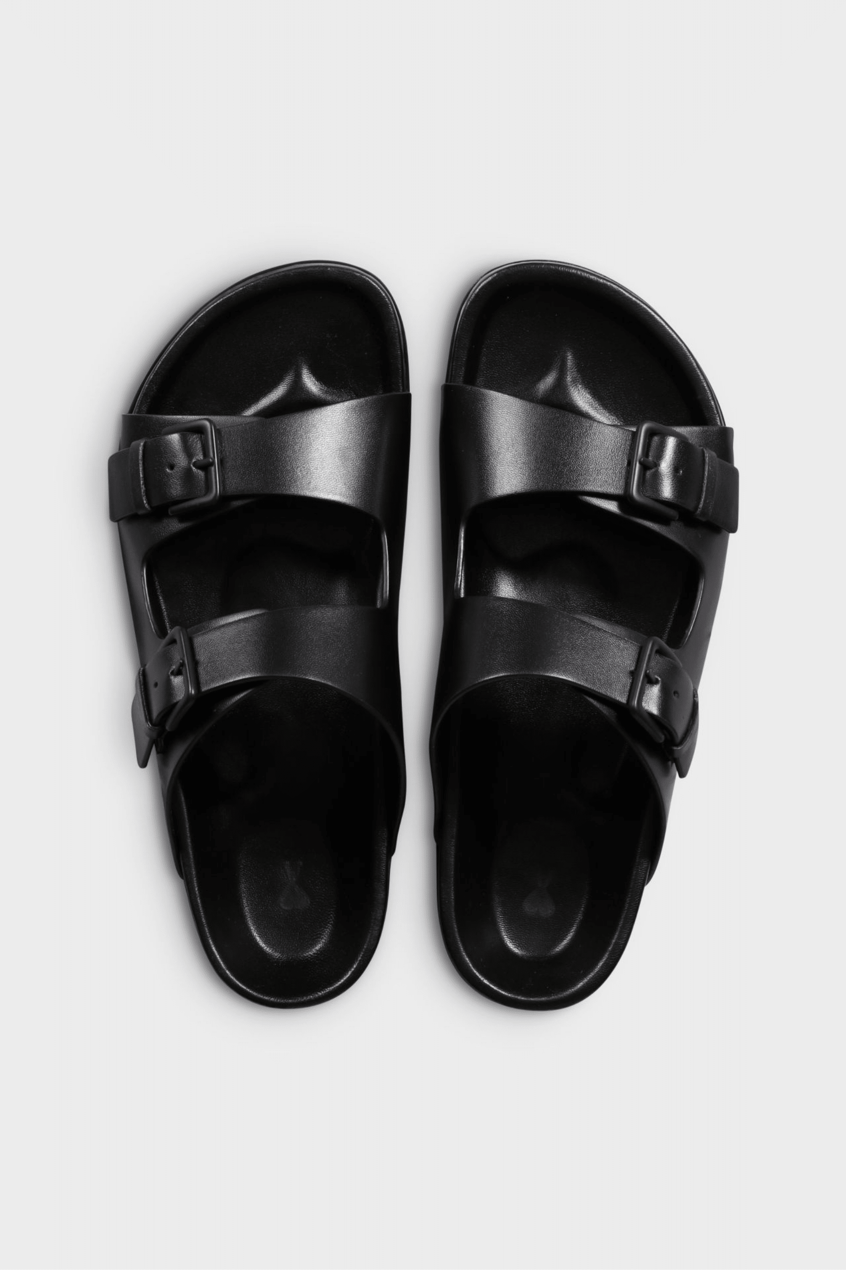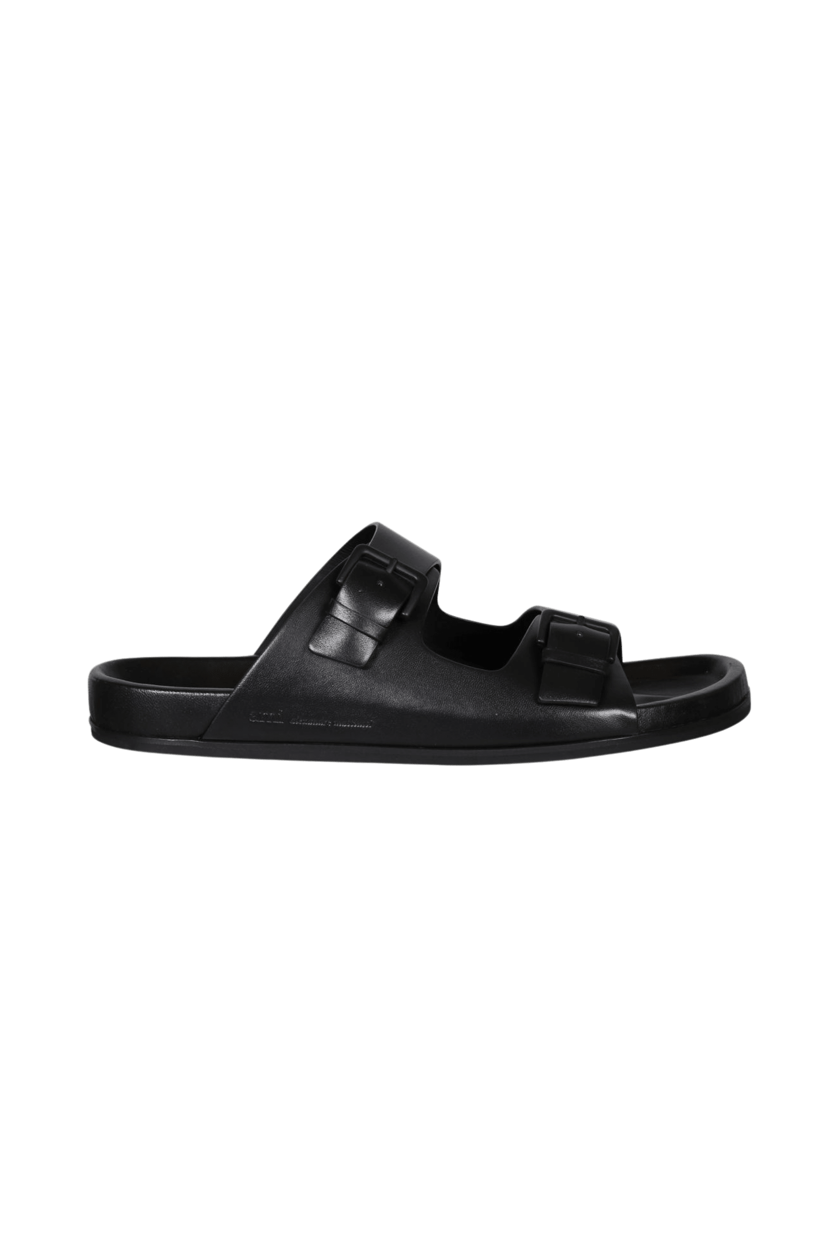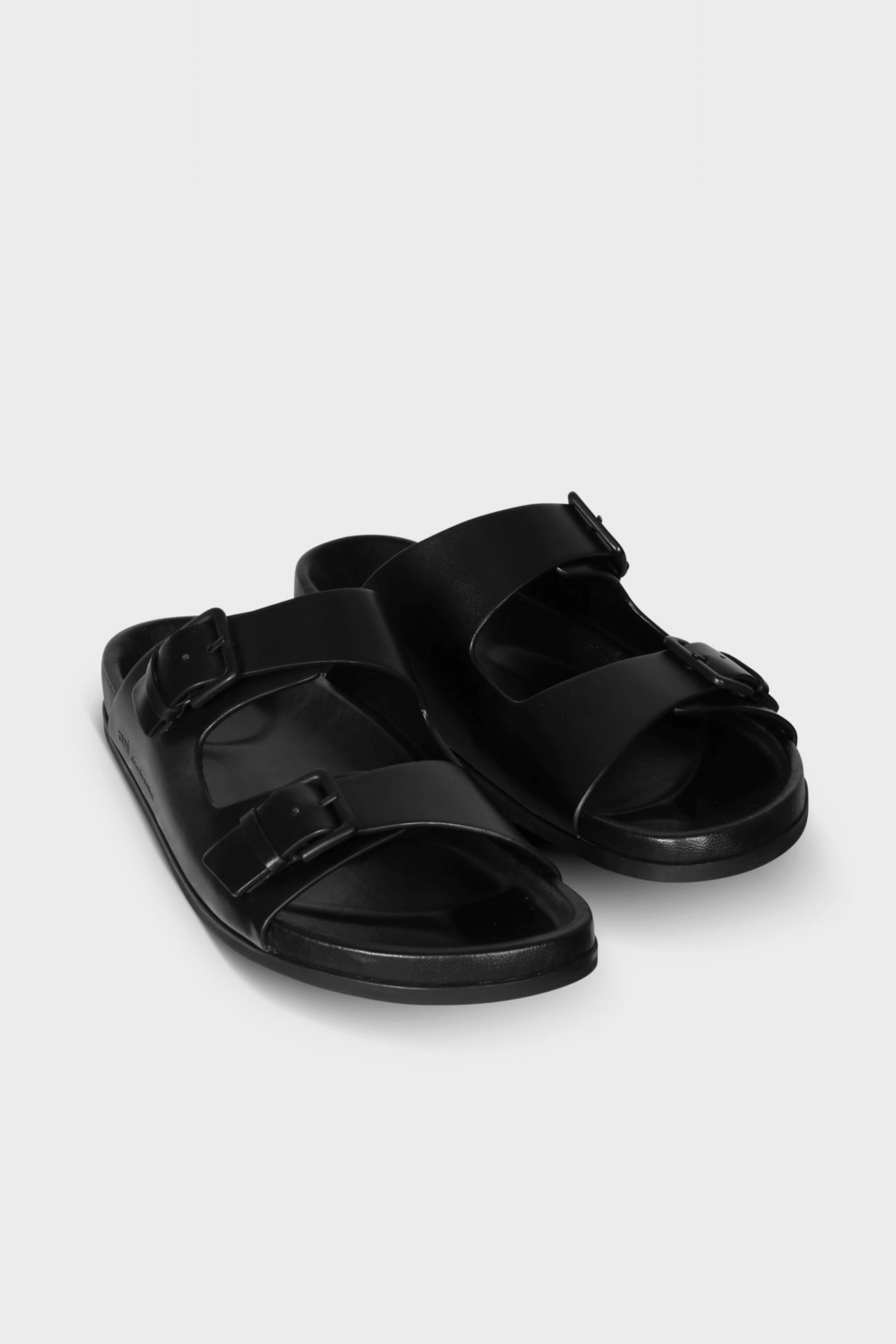 Sandales à Double Boucles Cuir Noir. Empeigne en cuir de veau. Semelle plate en caoutchouc. Fermeture à boucle ton sur ton.
