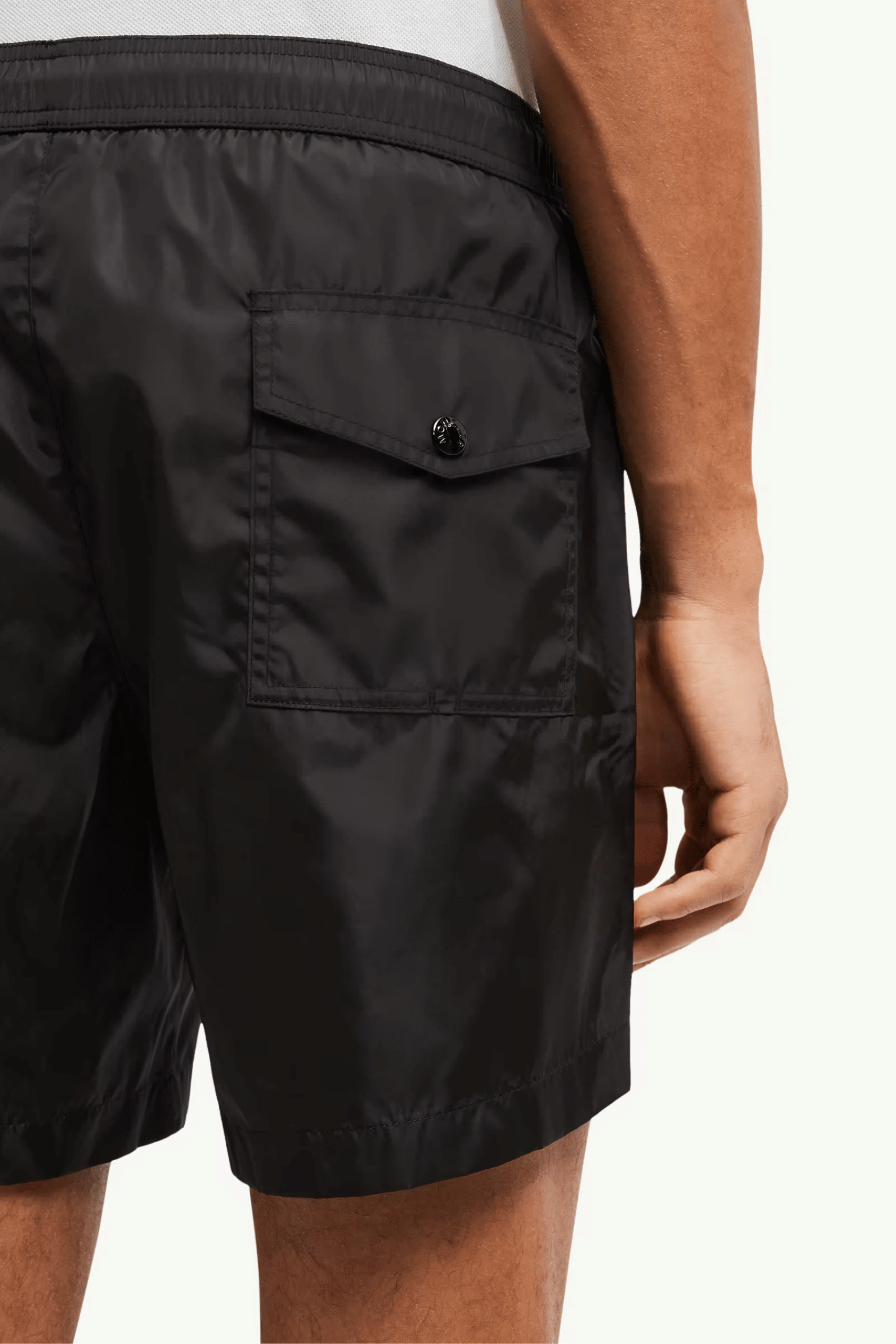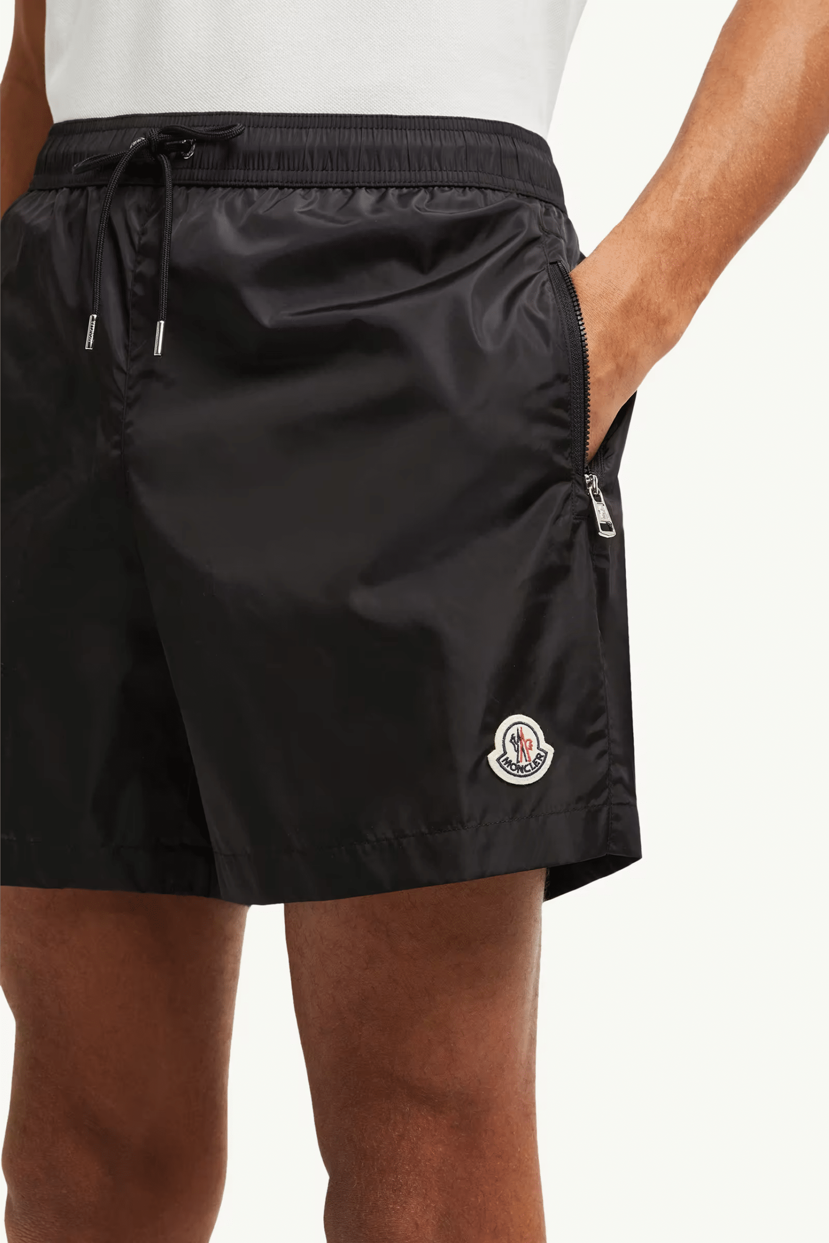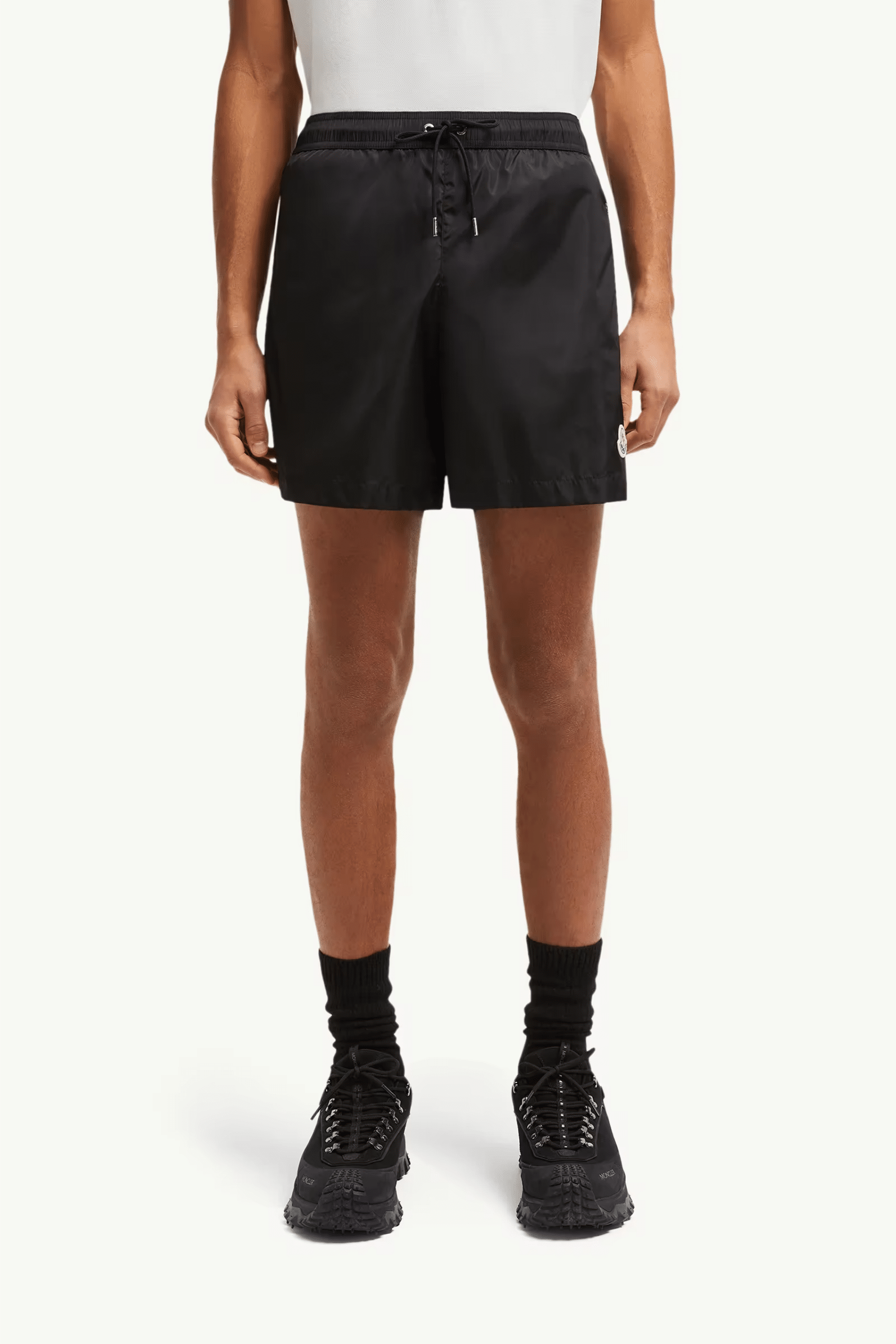 Short De Bain Noir Logo Tricolore, en nylon technique. Taille élastiquée avec cordon coulissant extérieur. Poches latérales zippées.