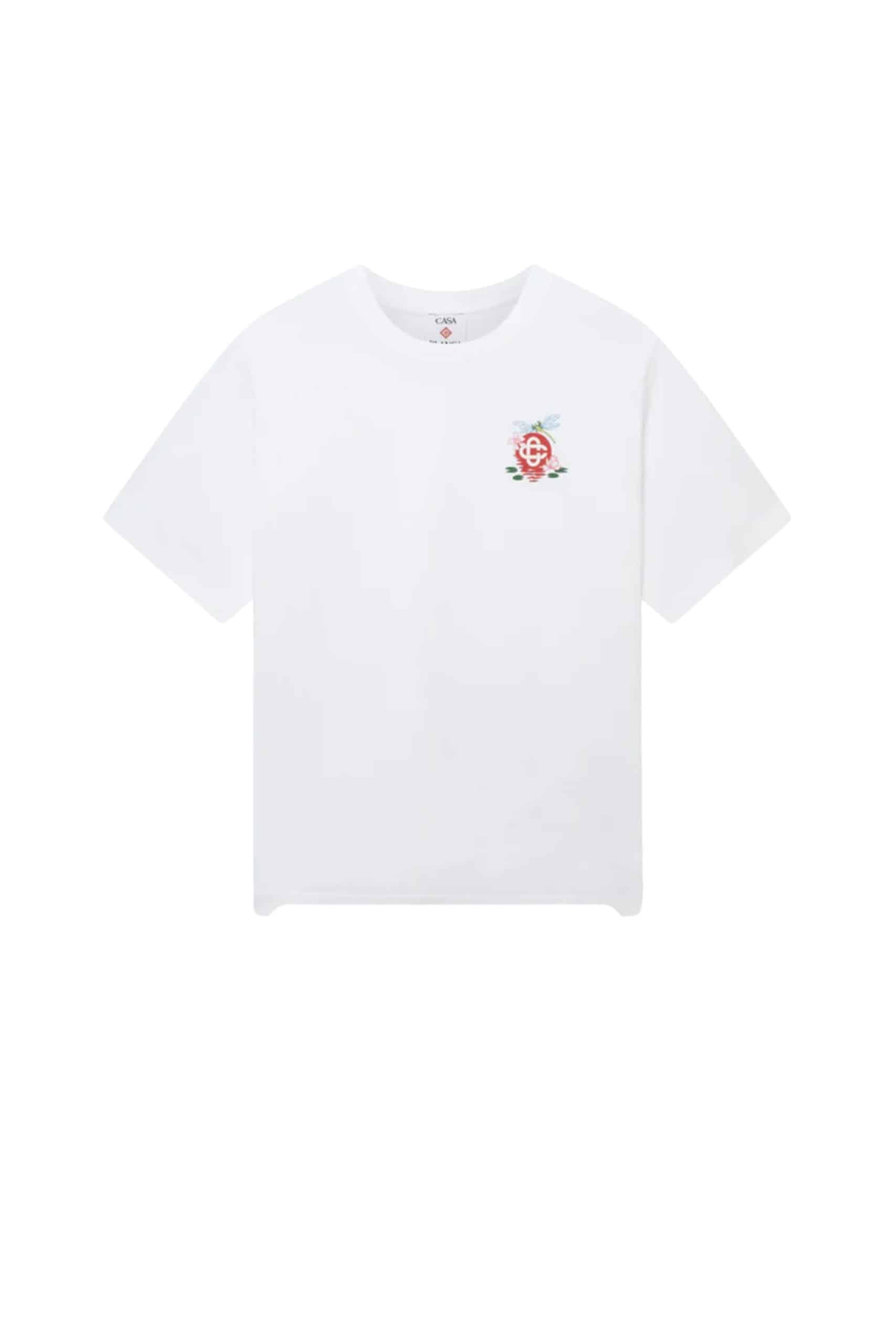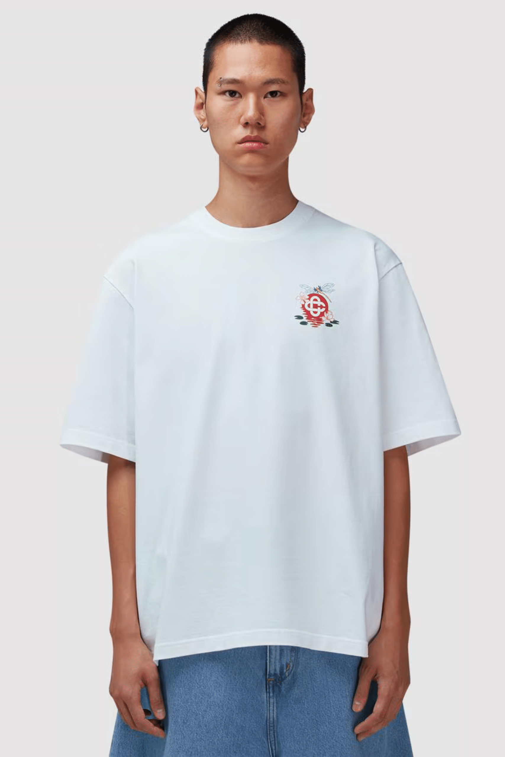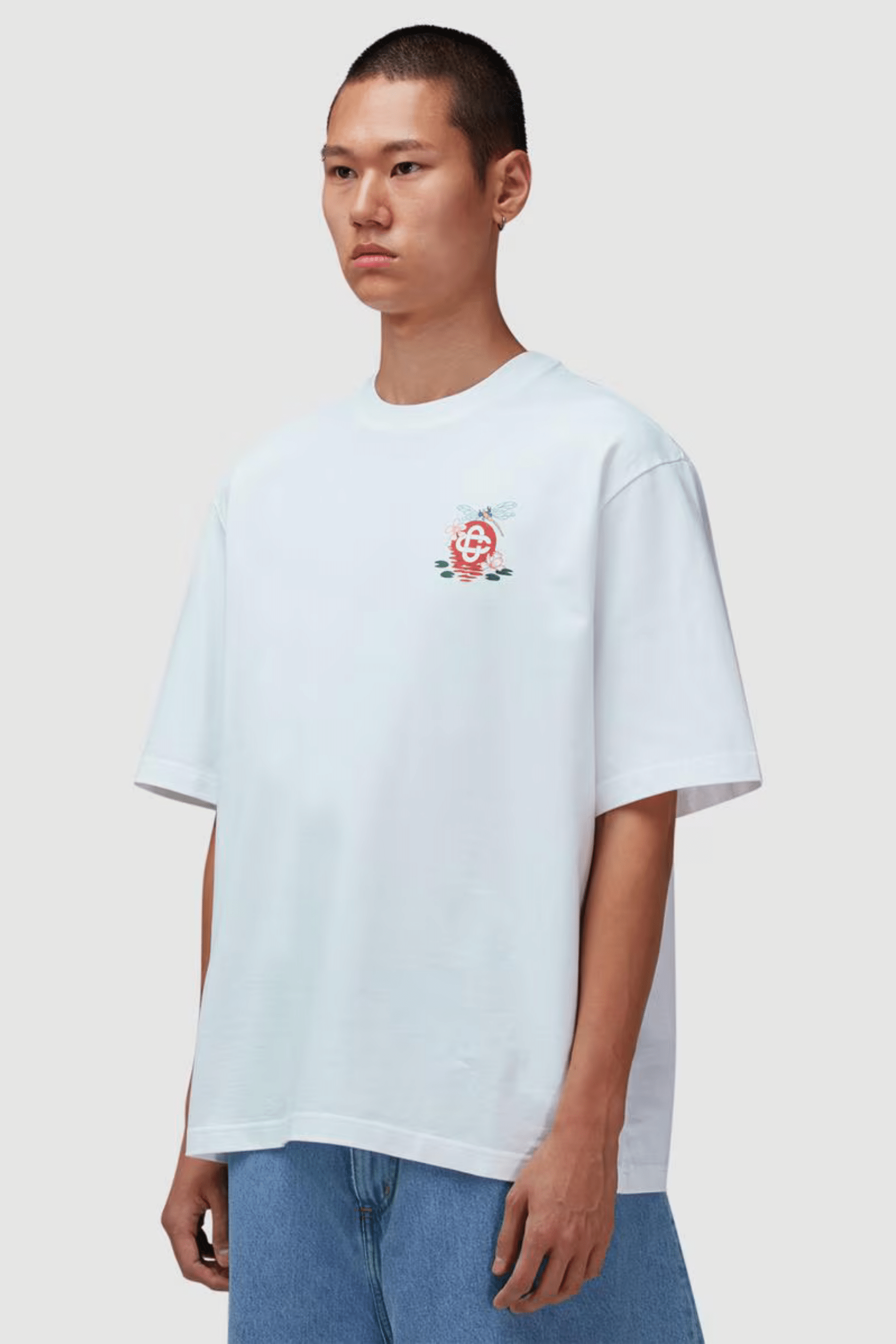 Tee-Shirt Floral Dragonfly Blanc. La libellule, symbole clé, contraste avec l’intensité des t-shirts Bōsōzoku, tandis que les fleurs de lotus et le reflet du soleil sur l’eau évoquent la symbolique de Casablanca avec la nature.