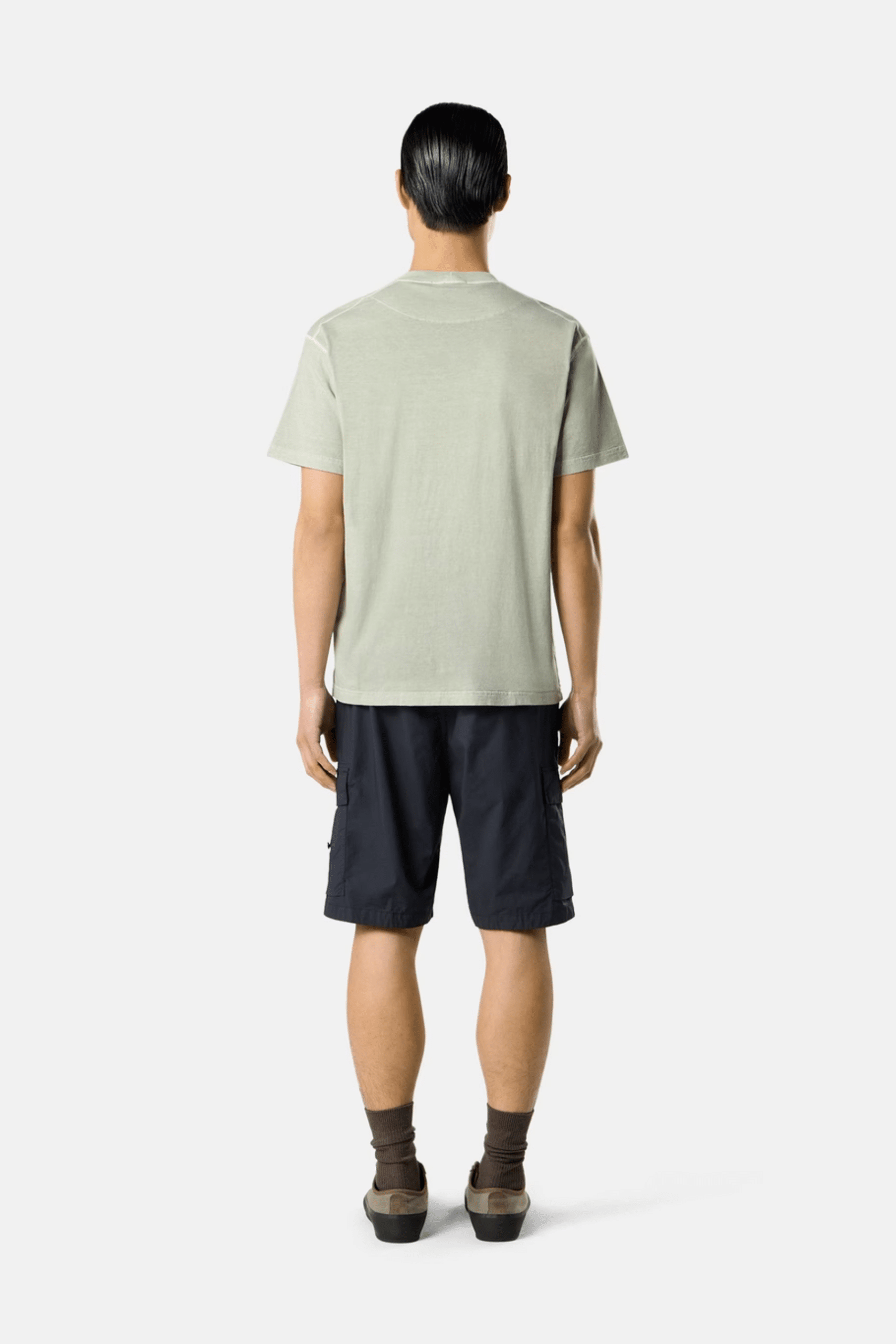 - Vêtement teint en pièce et traité avec l’effet « FISSATO », un procédé de traitement par résine soluble dans l’eau et une technique de teinture en pièce créant un aspect tridimensionnel.