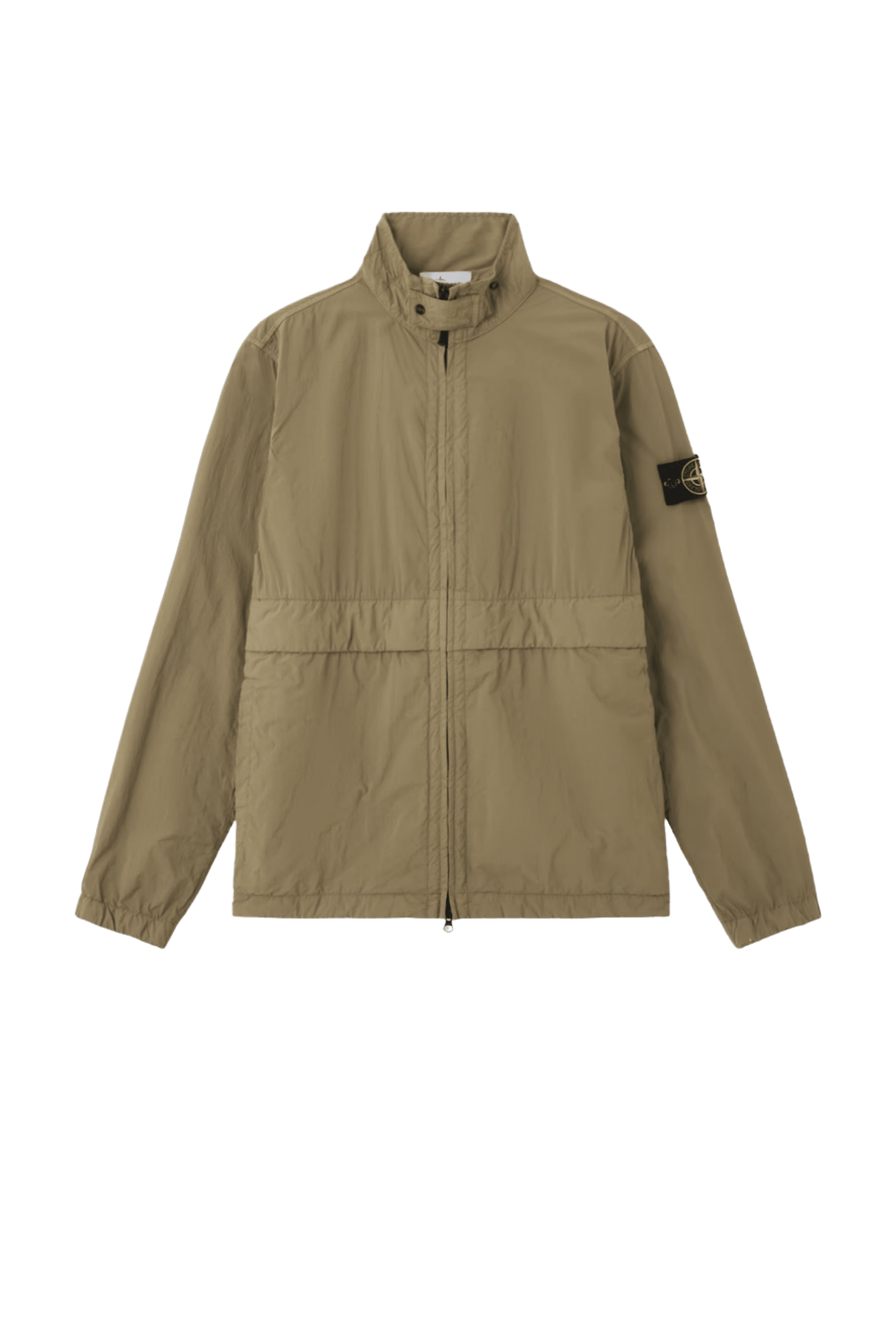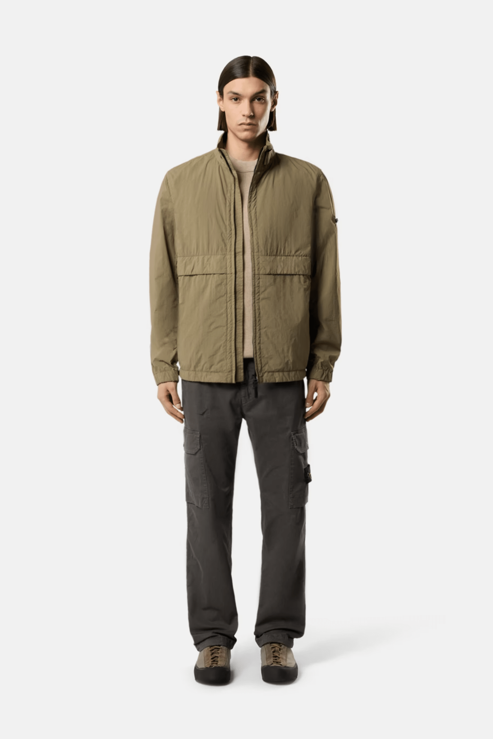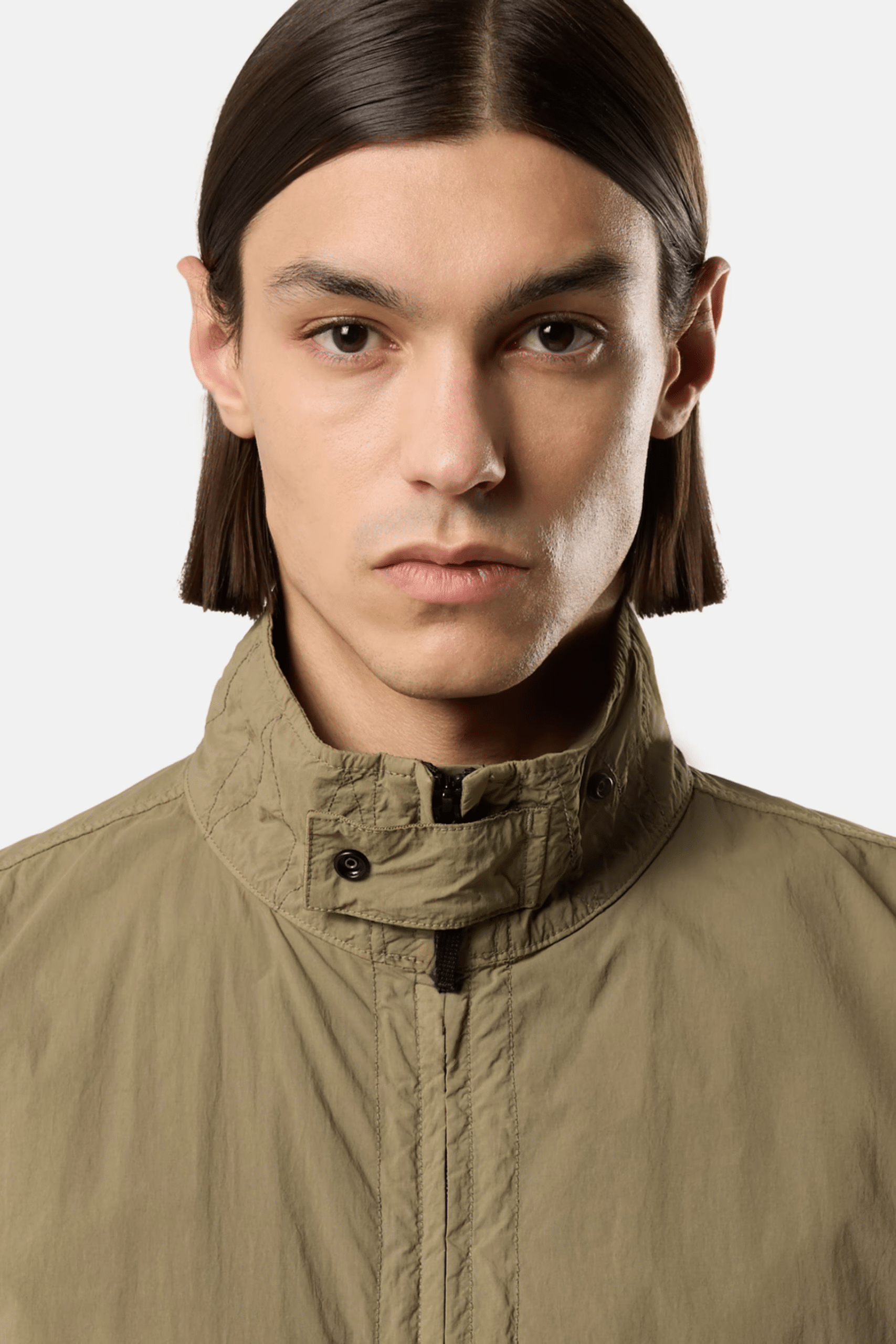 Veste Col Montant Nylon Kaki. Col montant avec bouton pression. Fermeture zippée devant. Poches latérales. Badge Stone Island sur la manche gauche.