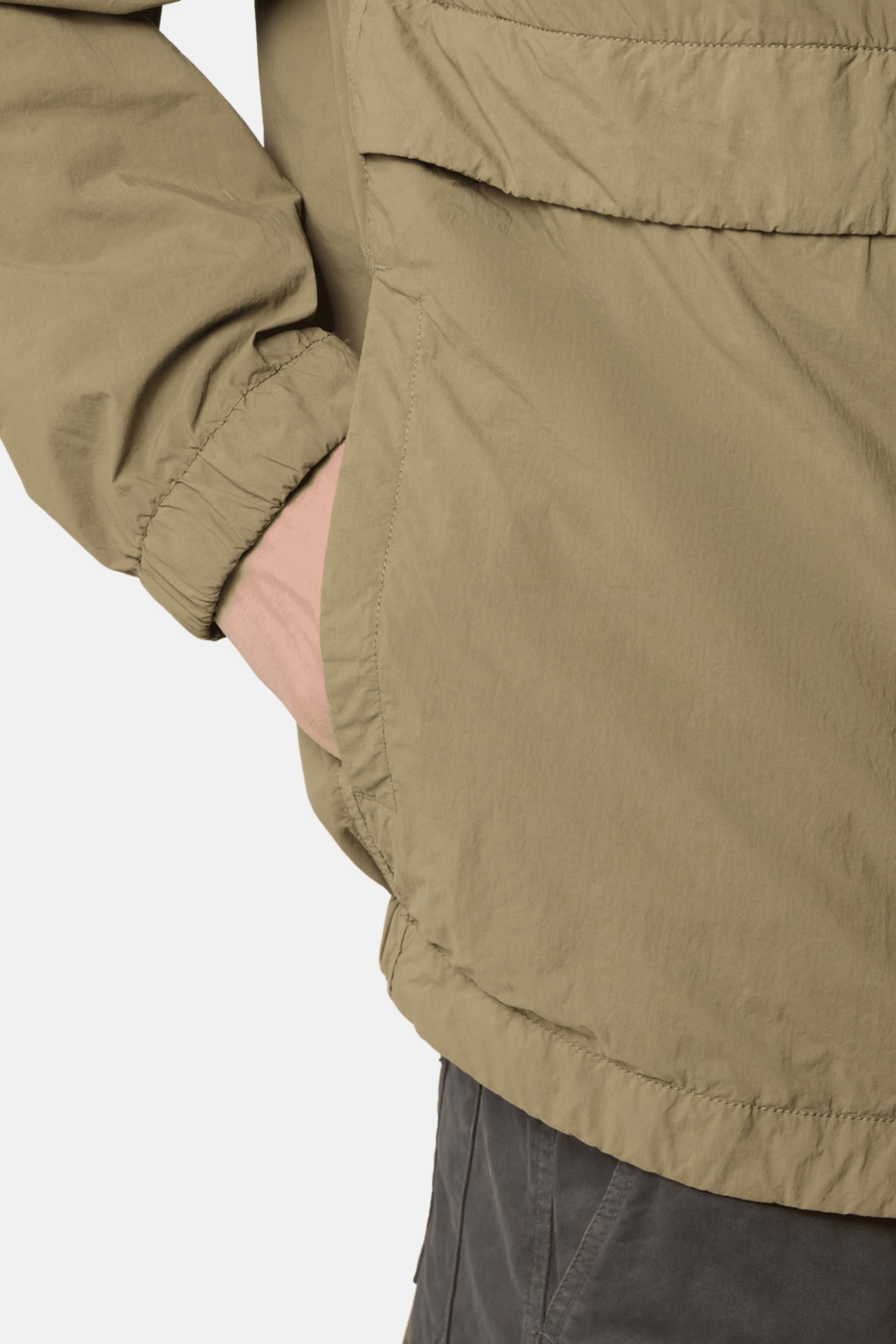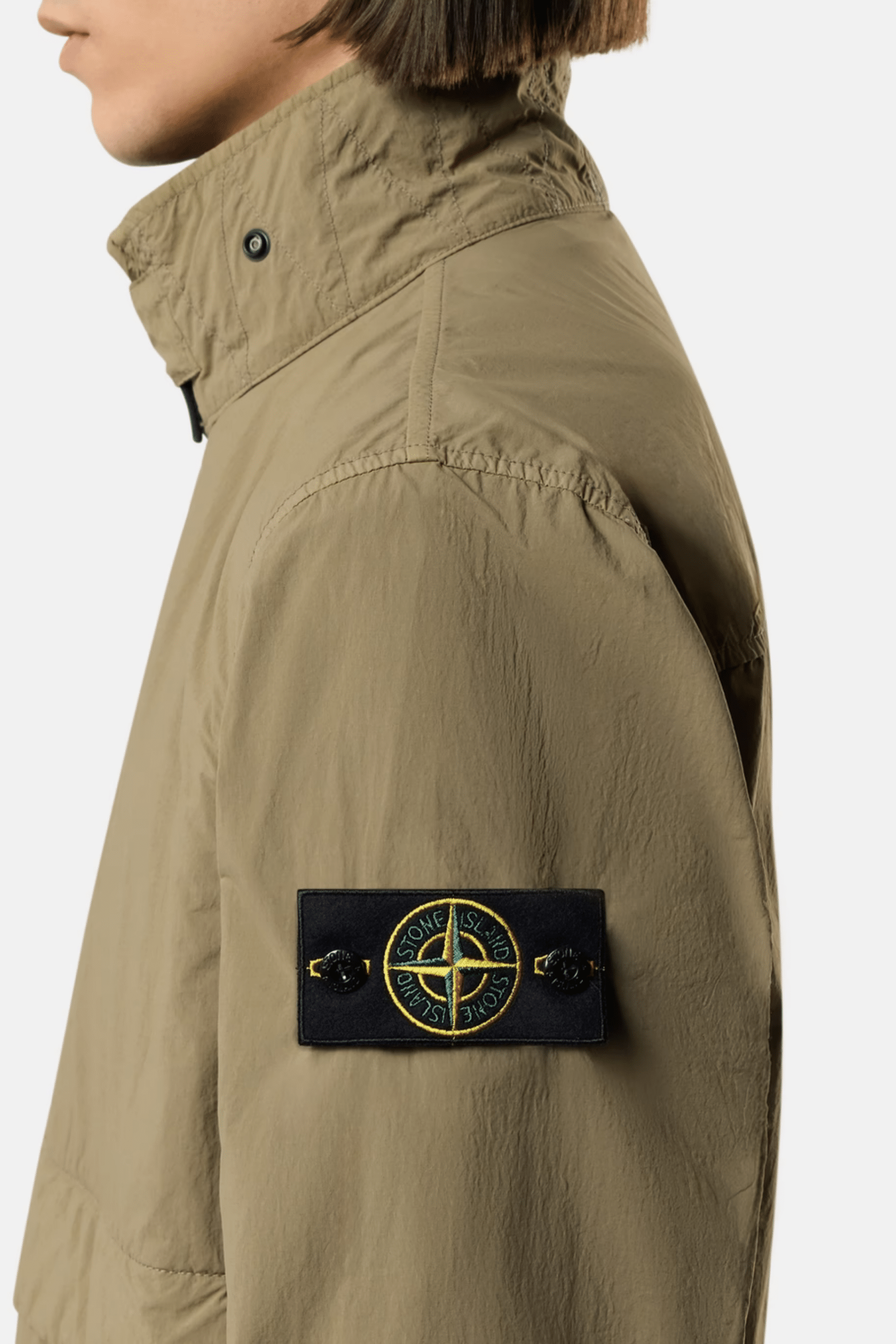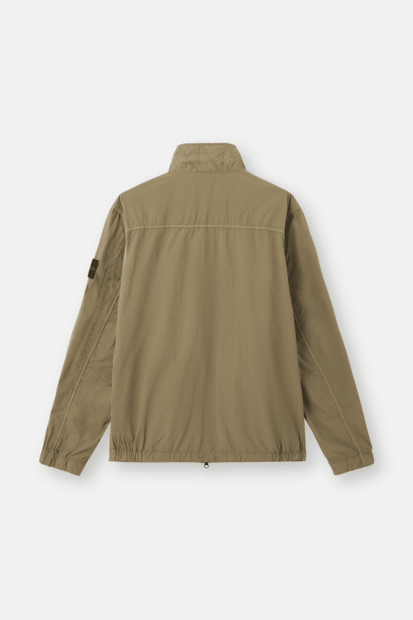 Veste Col Montant Nylon Kaki. Col montant avec bouton pression. Fermeture zippée devant. Poches latérales. Badge Stone Island sur la manche gauche.